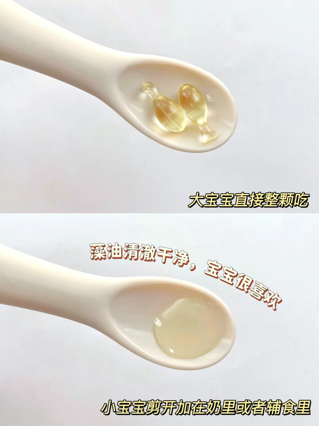 🍀软胶囊是用木薯淀粉制成的,大宝宝可以直接整粒吃,小宝宝可以剪开滴在配方奶或者辅食里。一颗就含100mgDHA,油质纯净,没有什么味道,小宝宝也容易接受。