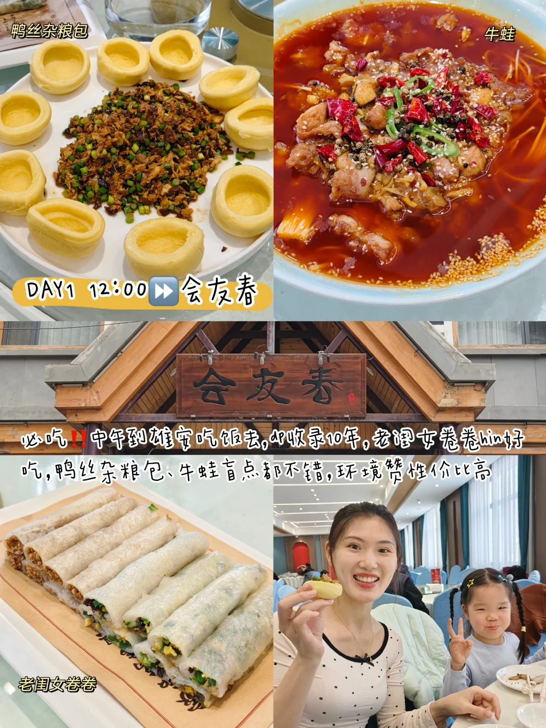 12:00⏩会友春:必吃‼️中午到雄安吃饭去,dp收录10年,老闺女卷卷好吃,鸭丝杂粮包、牛蛙盲点不错,环境赞性价比高