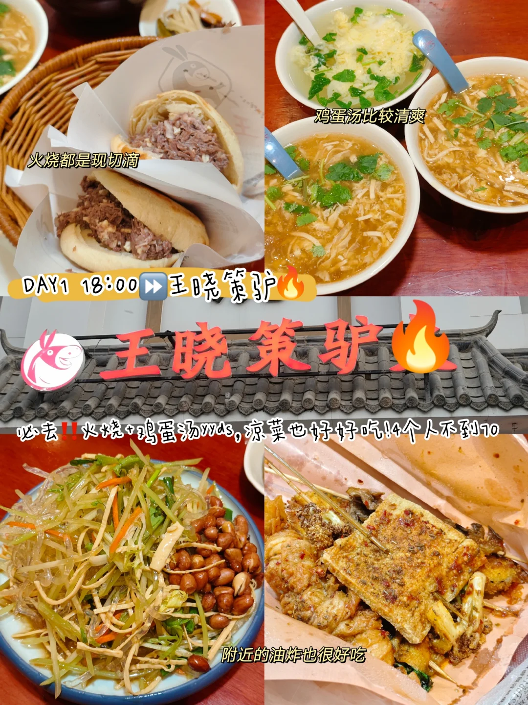 18:00⏩王晓策驴🔥:必去‼️火烧+鸡蛋汤yyds,凉菜也好吃!4个人不到70