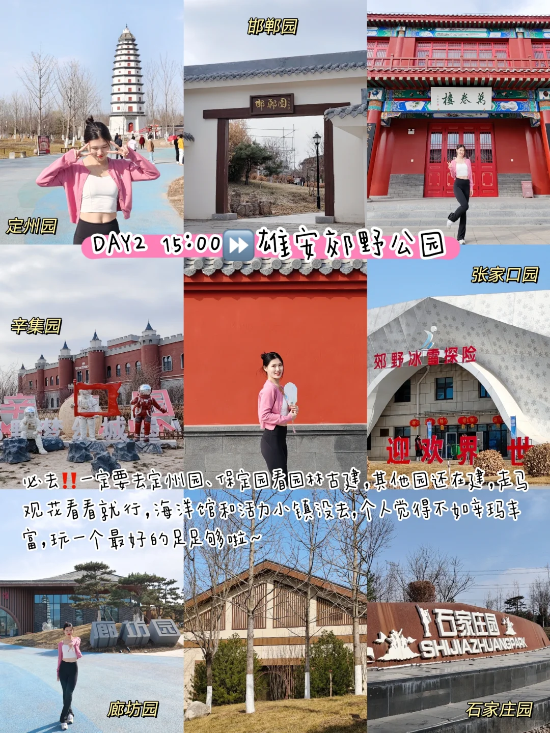 15:00⏩雄安郊野公园:必去‼️一定要去定州园、保定园看园林古建,其他园走马观花看看,海洋馆和活力小镇没去,个人觉得不如辛玛丰富,玩一个最好的足够啦~
