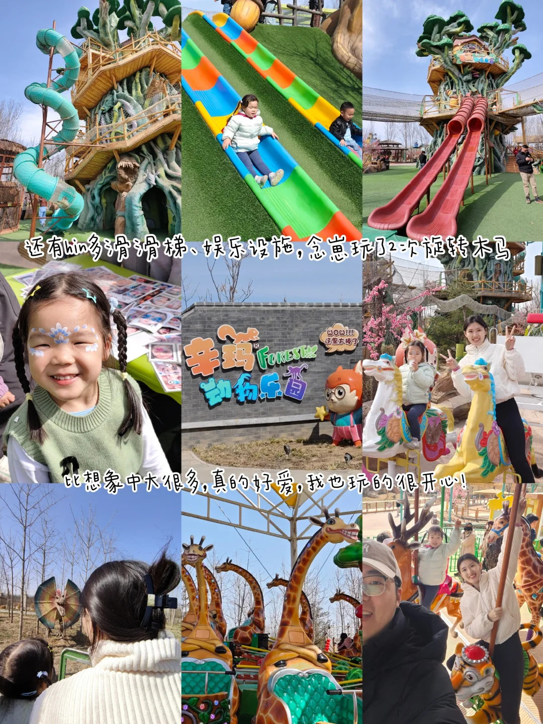 ①上午,一去先喂小动物🐷🐰🐏🦆🦌🐴,喂完去玩娱乐设施,小火车、旋转木马、长颈鹿转转椅、侏罗纪畅玩,下午人多要排队!