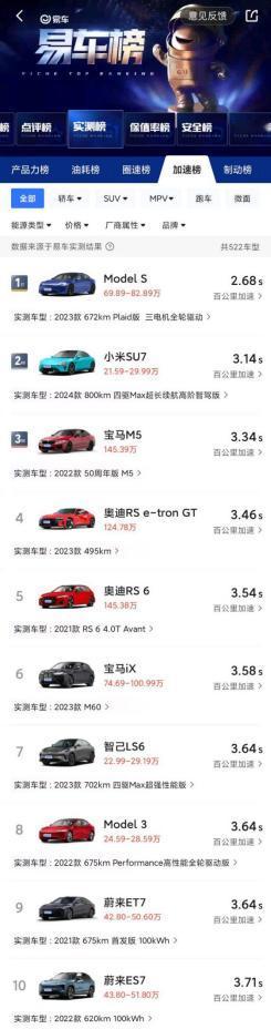 市场上有不少声音在否定小米汽车,但是实测数据表明,小米SU7 Max的续航达成率和百公里加速都是顶级的,到底该听谁的? 此前,懂车帝对小米SU7的续航进行了测试,成绩高达643km,这一表现远超同级别竞品,引发了部分网友的质疑,他们认为测试条件可能不够公正,特别是19英寸运动轮毂的使用。 然而,易车平台最近采纳了网友们的建议,对小米SU7 Max换上了21英寸轮毂再次进行续航测试。表现依旧亮眼,实际续航成绩达到了560km,依然力压小鹏P7、极氪001、比亚迪汉EV等同级别车型。 在21英寸轮毂下,CLTC续航预测为725km,而实际测试达到560km,达成率高达77.2%。这一成绩无疑为小米SU7的续航能力提供了强有力的证明,也让此前的质疑之声逐渐平息。 虽然续航方面小米SU7并未达到第一,但在加速性能方面,实测达到3.14s的零百加速成绩,让小米SU7在易车平台522款车型中位列第二,仅次于售价高达八十多万的特斯拉Model S。 事实胜于雄辩,面对网友的挑剔和质疑,小米选择了以数据作为最有力的回应。无论是续航能力还是加速性能,小米SU7都通过精准的数据,让真实用户得以心安,也让质疑者们哑口无言。我想,该听谁的应该心里有底了吧?