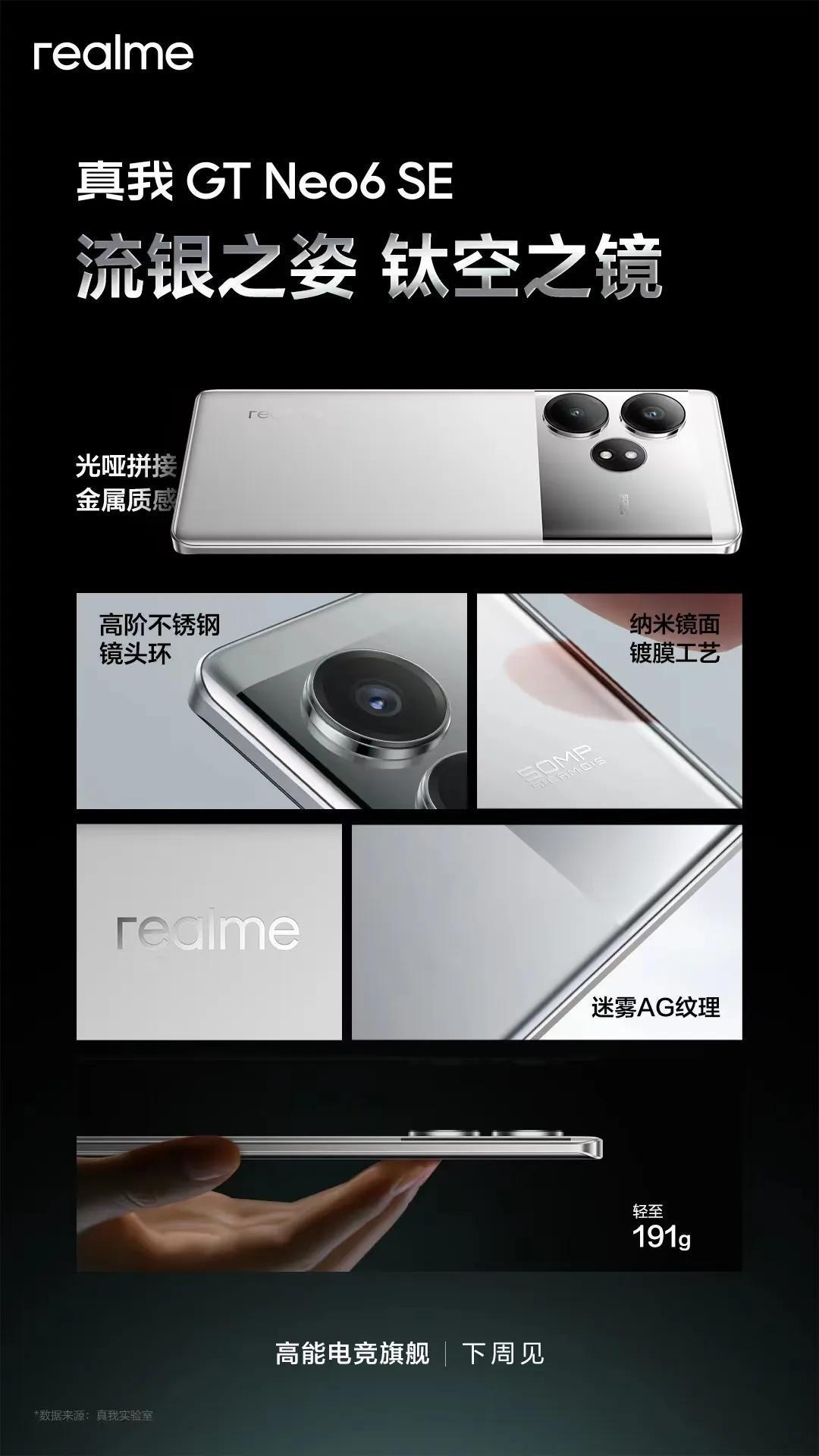 真我这个品牌很神奇,一些定位在千元机市场的机型,比如真我GT Neo 6 SE外观首爆,其颜值可谓出类拔萃,属实是把高端的设计理念以大众化呈现。 纵观整个千元机市场,真我的颜值无疑是佼佼者。最近,官方揭晓了真我GT Neo6 SE的外观设计,那独特的“流银骑士”配色,结合亮面与哑光的巧妙拼接,仿佛流露出旗舰机特有的钛金属质感。而镜头模组更是采用双圆环独立设计,这一细节让人赞不绝口。加上重量仅191g,轻巧便携,想必手感会非常好。 不过只有背面好看可不行,手机的正面设计才是核心,正面极窄边框微曲屏,看上去边框与下巴都是极窄设计,搭载了与京东方深度合作的定制无双屏,屏幕峰值亮度高达6000nit,堪称全球手机屏幕亮度之最。同时,它还是同档唯一采用8T LTPO技术的手机。这样的颜值与屏幕素质,在千元机市场中无疑是一枝独秀。