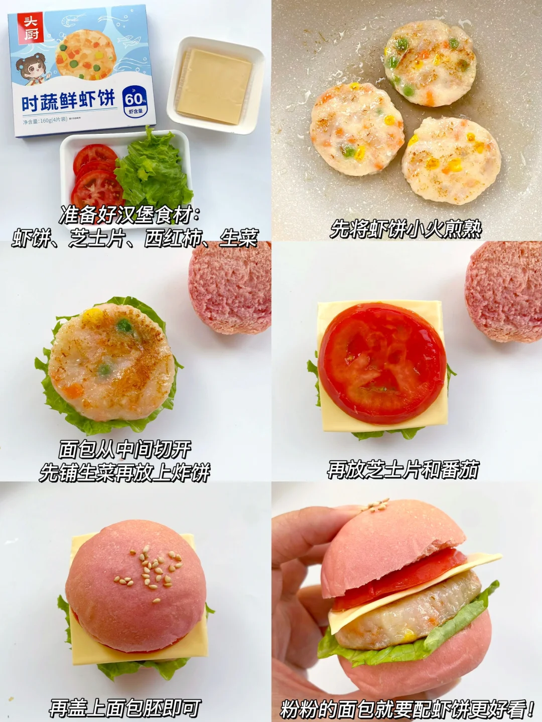 🍤虾饼无需解冻直接放入锅中小火煎熟,中间多翻面几次,软嫩Q弹,味道就是鲜虾本身的味道。🍔做好的面包中间切开夹上虾饼、西红柿、生菜和芝士片就可以啦‼️