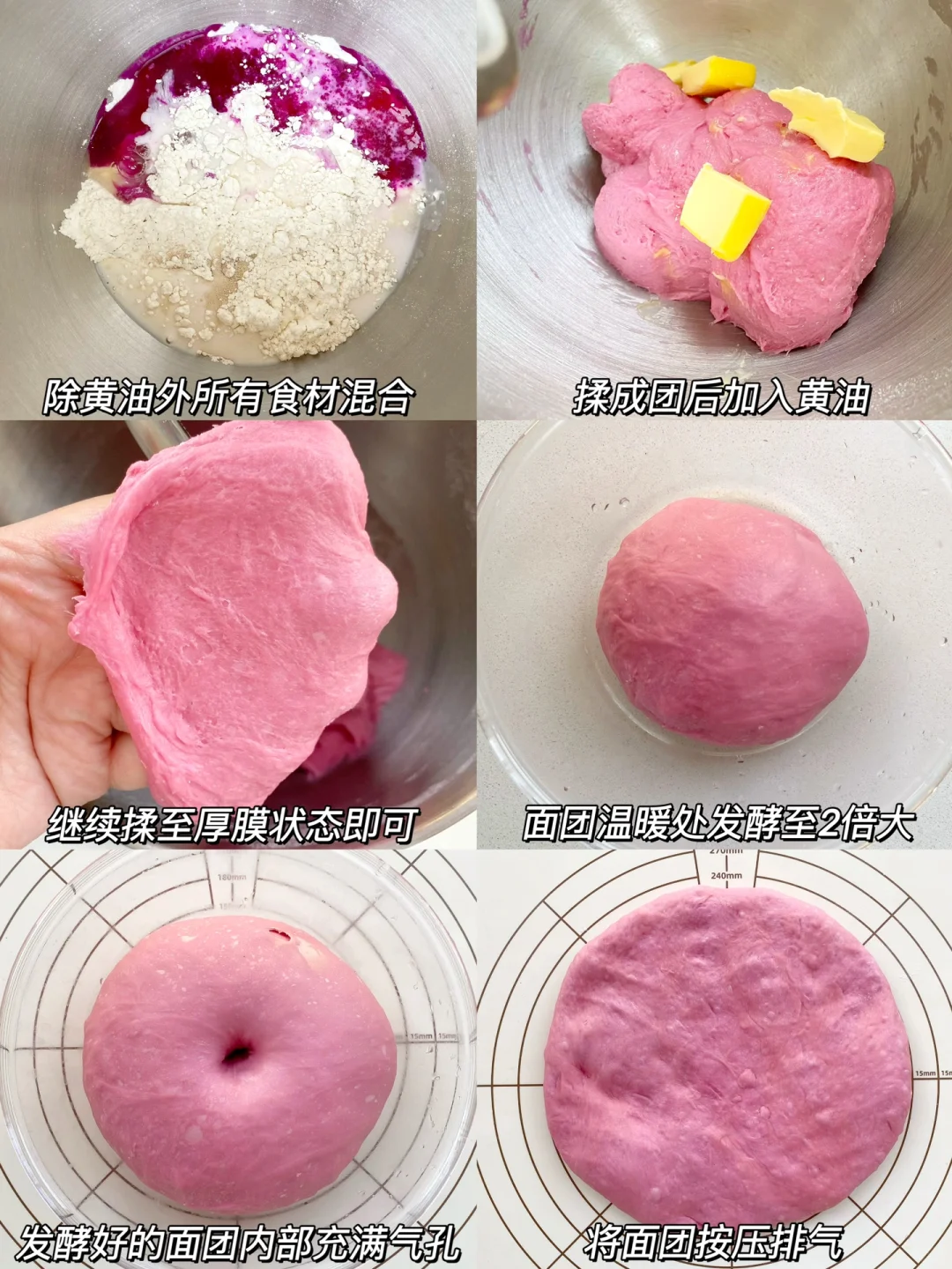 1⃣️除黄油外其他食材混合成团,再加入黄油继续搅拌至厚膜的状态。放置温暖处发酵至2倍大。