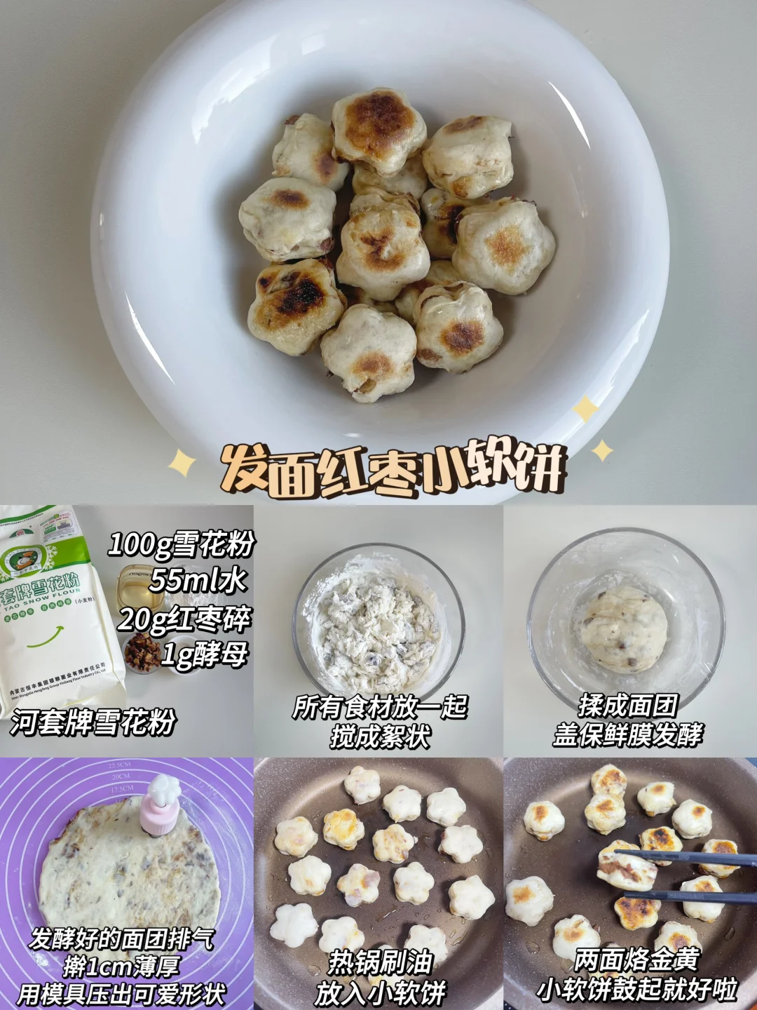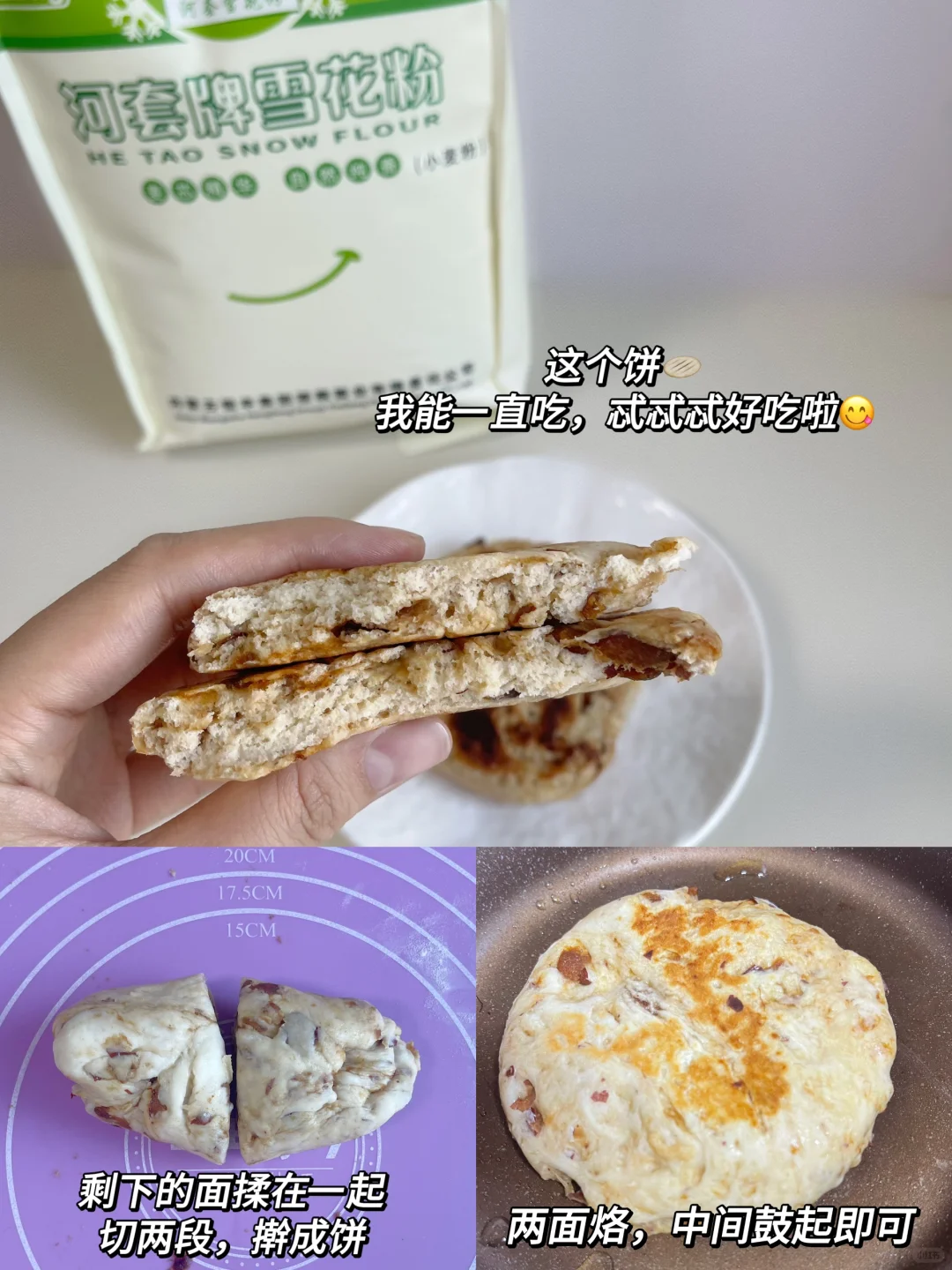 早餐:牛肉锅盔+南瓜银耳露 午餐:发面红枣小软饼+山药猪肉蒸蛋汤 晚餐:苹果玉米粥 今天的牛肉锅盔和红枣小软饼太好吃了 真的要给宝宝们安排,简单0失败 [色色R][色色R] [种草R]所有食材根据宝宝咀嚼能力准备哦~ ————————————————— 做发面红枣小软饼,我用的是河套雪花面粉,值得信任,绿色工厂加工制作,很适合给宝宝吃,配料表干净、蛋白质高,雪花粉的粉质呈乳白色,颜色亮,塑性好,平时给宝宝做饺子、包子、馒头、面包、蛋糕都可以哦✅ ———————————————————