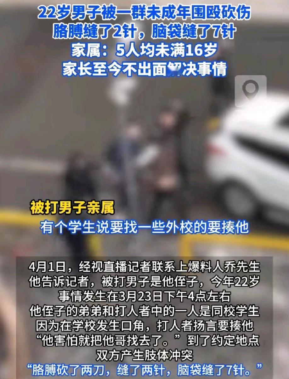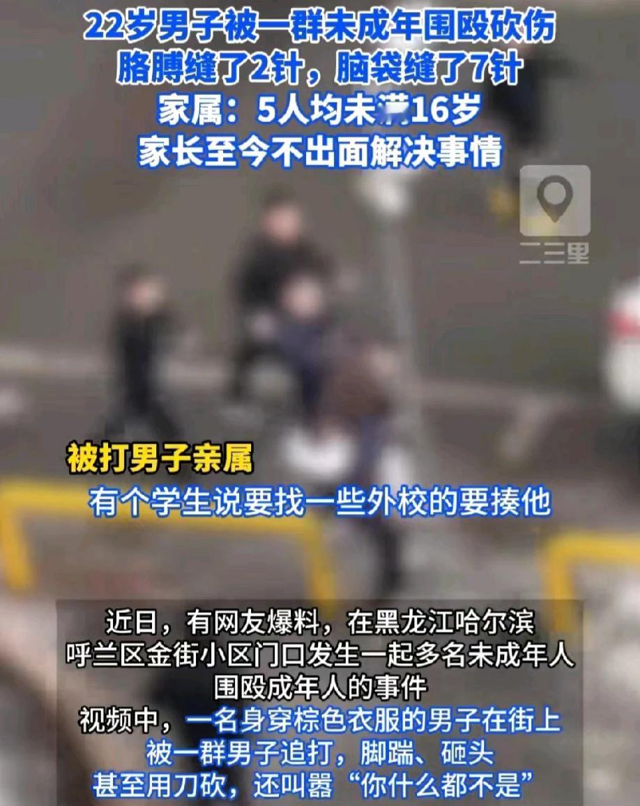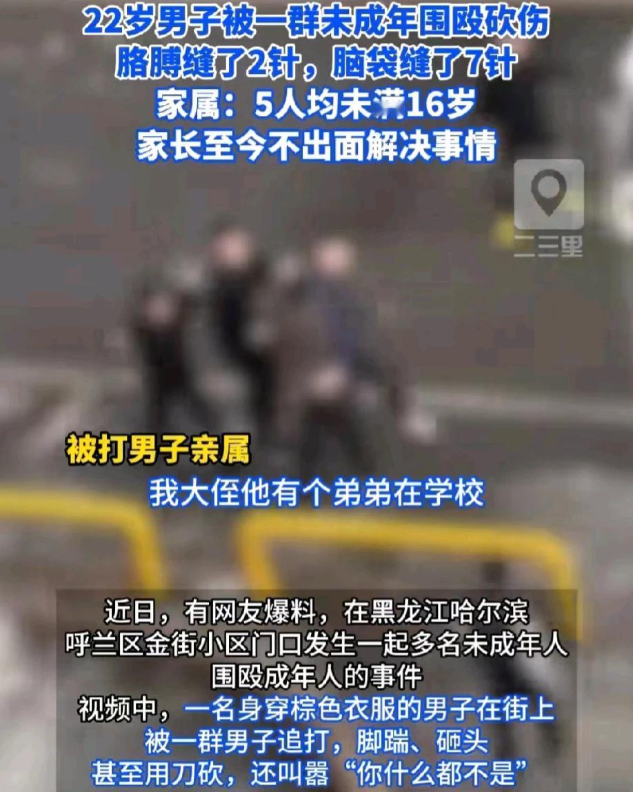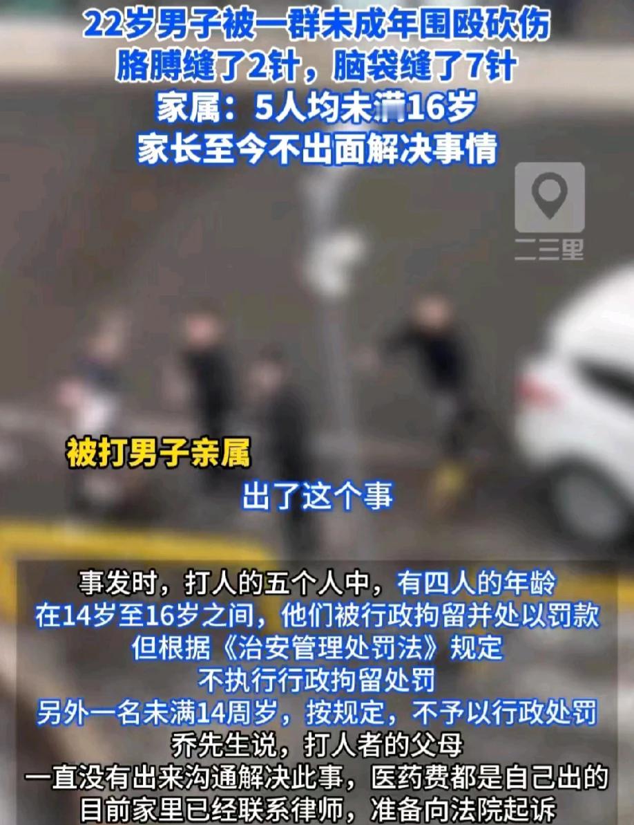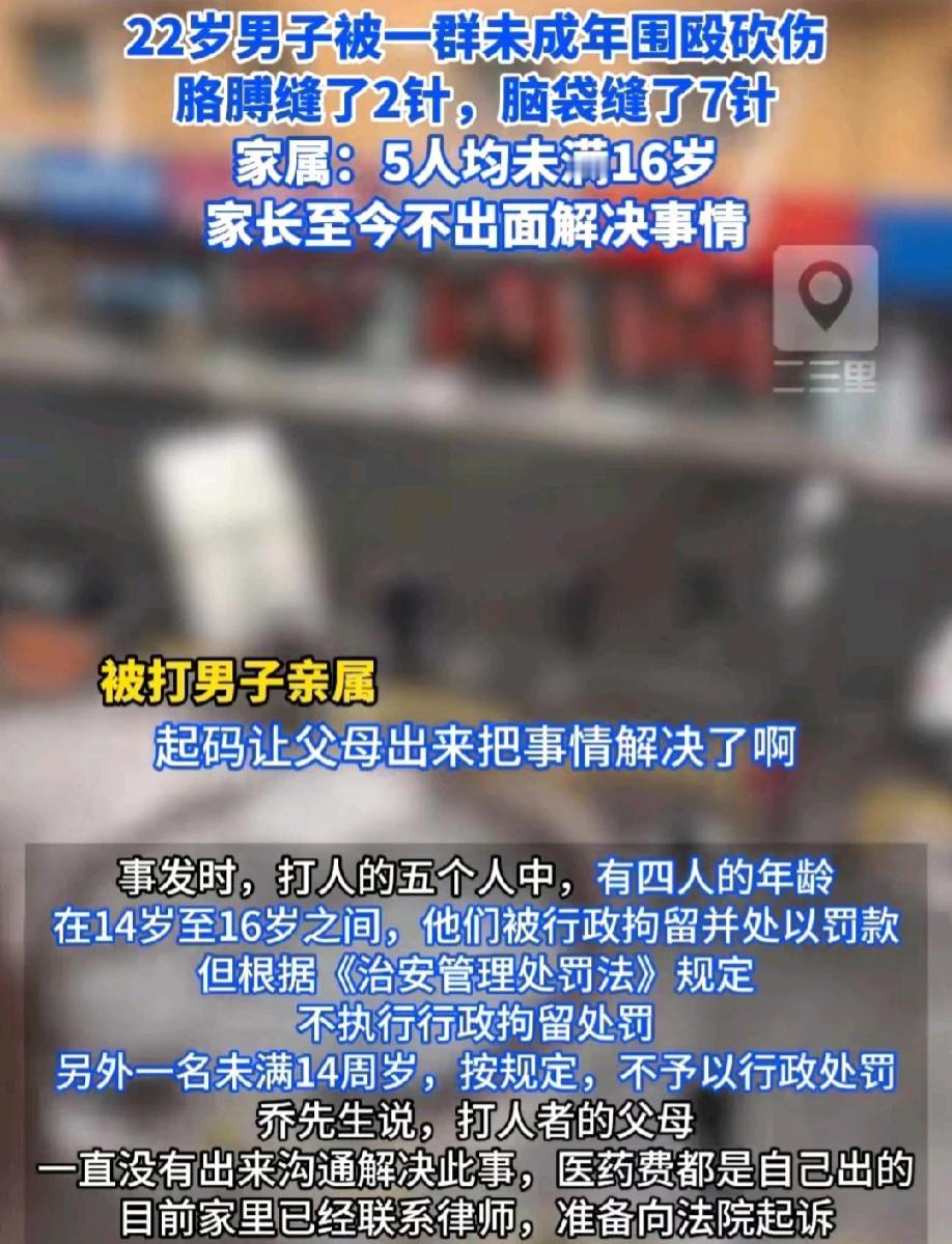 黑龙江哈尔滨,某小区门口,五名未成年人围殴一名22岁的男子。5名未成年人追打男子,用脚踹,用砖头砸,甚至用刀砍,还口出狂言的说道,你什么都不是。22岁的男子被打的落荒而逃。男子胳膊缝了2针,脑袋缝了7针。但因为5人均未满16岁,没有对他们执行行政拘留,而且他们的父母也不出面赔偿和道歉。