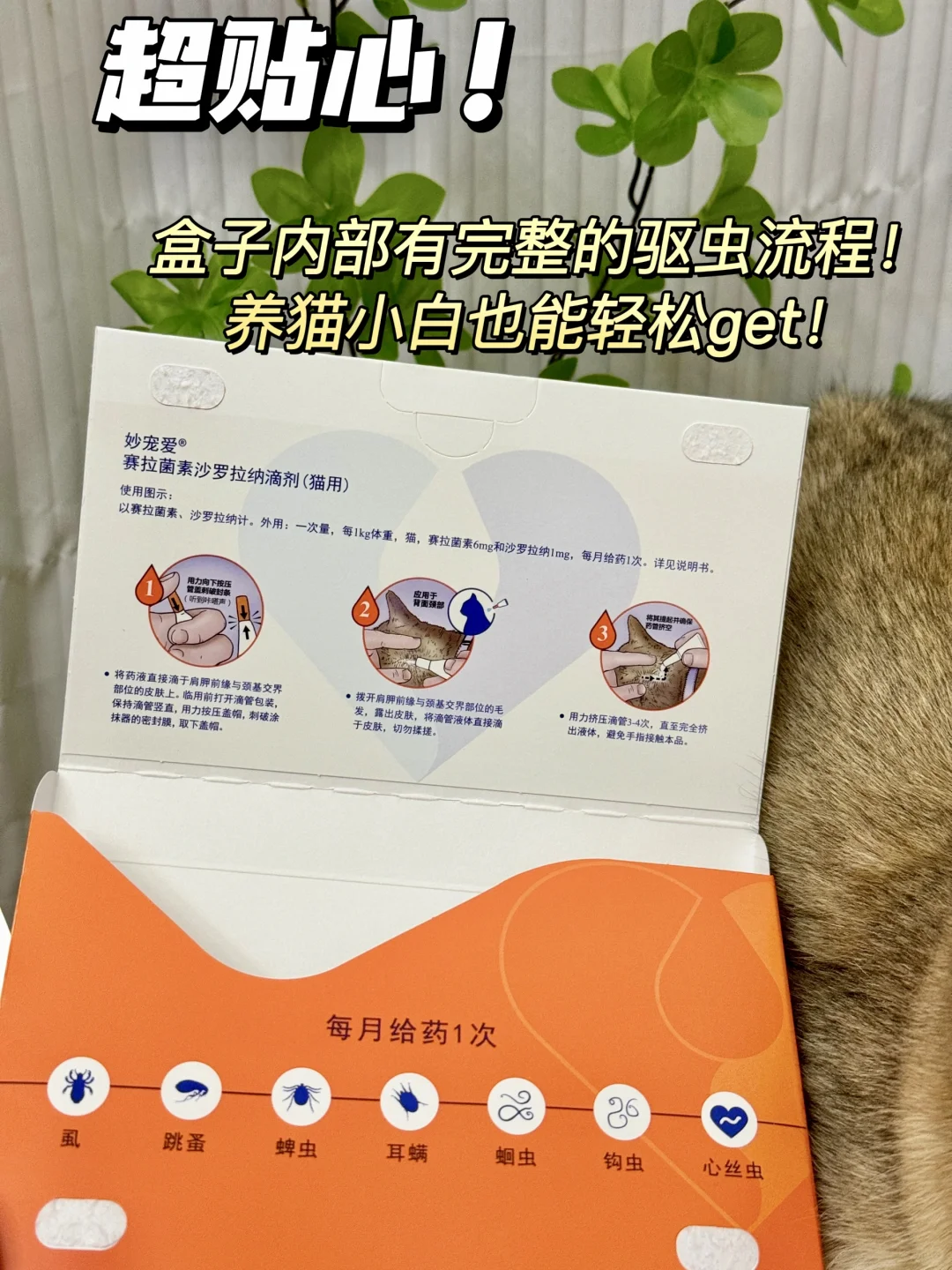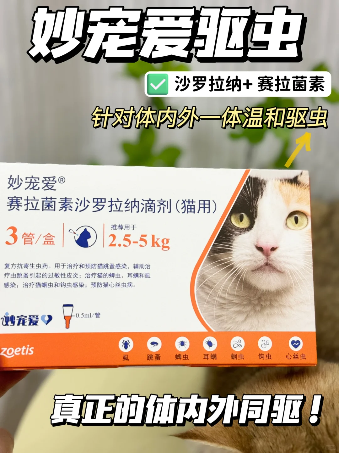 -我非常喜欢的妙宠爱的主要成分就是沙罗拉纳跟赛拉菌素的组合🔆,达到了内外同驱的效果,像在猫咪身上比较常见且高危的跳蚤、耳螨、虱子、蜱虫、蛔虫、钩虫、心丝虫一共7种寄生虫它都可以驱除,而且两种成分协同作用,对跳蚤和耳螨的效果更好,还能从源头驱sha绦虫宿主,虫谱不要太广。