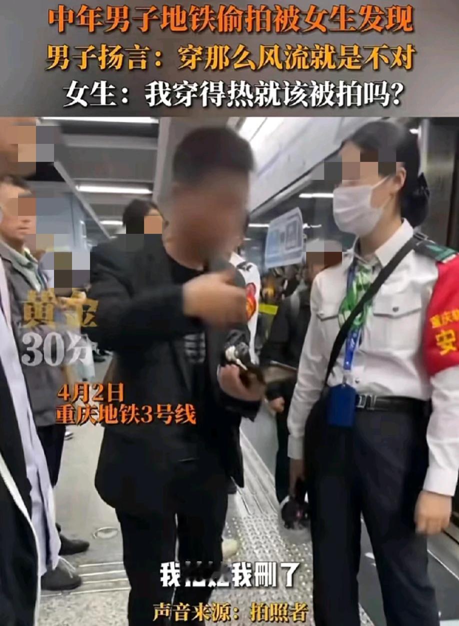 “她那么风流,我拍有错吗?”重庆,在地铁车厢上,一男子开着闪光灯偷拍女生。被女生发现后,男子不承认。后来在地铁安保员的介入下,检查男子的手机,果然有被偷拍的女生的照片。男子被迫删除,但很不服的说道,女子穿的那么风流,拍拍不是很正常的嘛。可被偷拍的女孩很生气,但男子委屈的说道,我已经删了照片,你还想怎样?