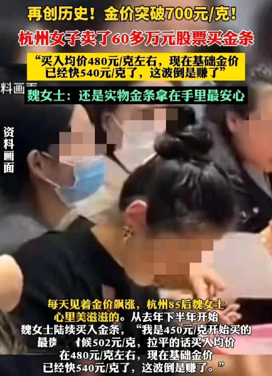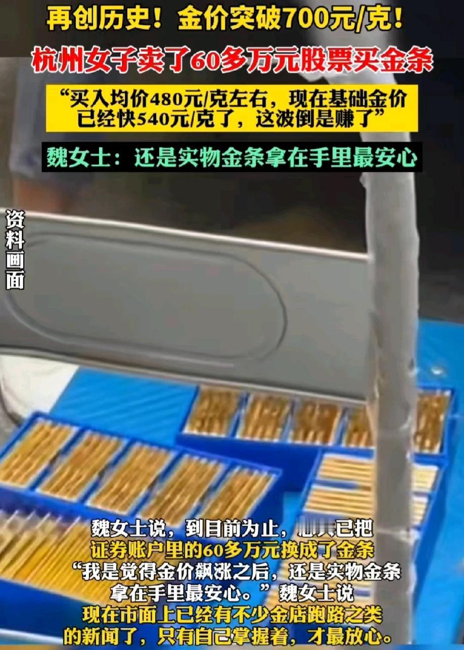 浙江杭州,一85后女子,将证券账户里的价值60多万的股票全部卖了。然后用60多万元全部购买了黄金。当时女子购买黄金的价格是450元一克,现在黄金价格每克已经涨到了700元。女子觉得,还是将黄金拿在手上最安心。