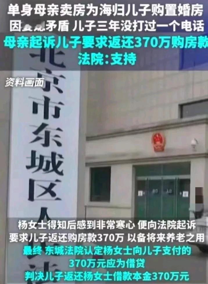 北京,一女子离异,但还是勒紧裤腰带,送儿子去国外留学。儿子学成归国后,女子又给了儿子370万元,购买婚房,房子登记在儿子名下。后来,女子与儿媳有矛盾,儿子站在他妻子这边,两人搬出去住。儿子三年多不联系母亲。儿子还想要将女子扫地出门。女子心寒,迫于无奈,一纸诉状起诉儿子,要求儿子归还370万元的购房款。儿子却辩称,是赠与。最后法院是这样判的。