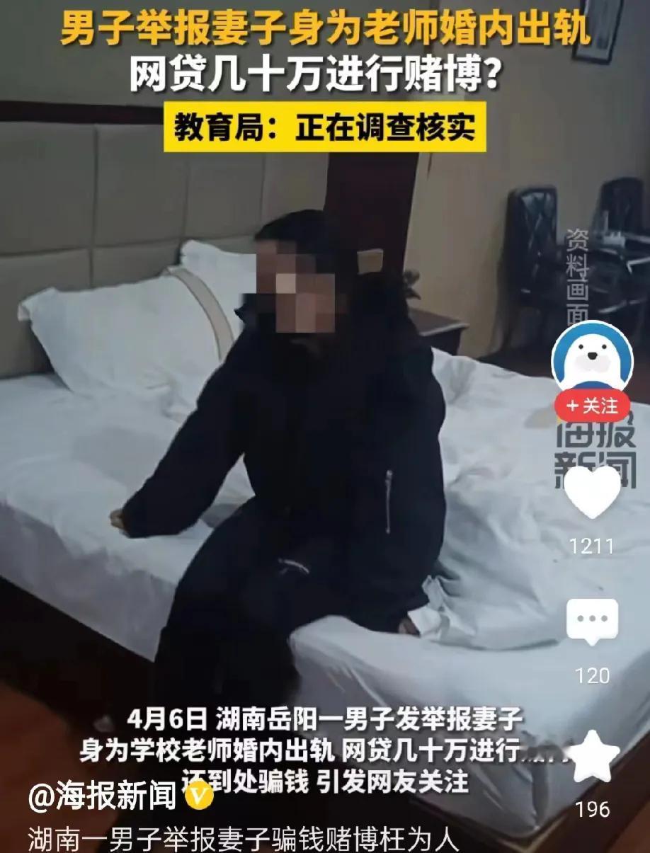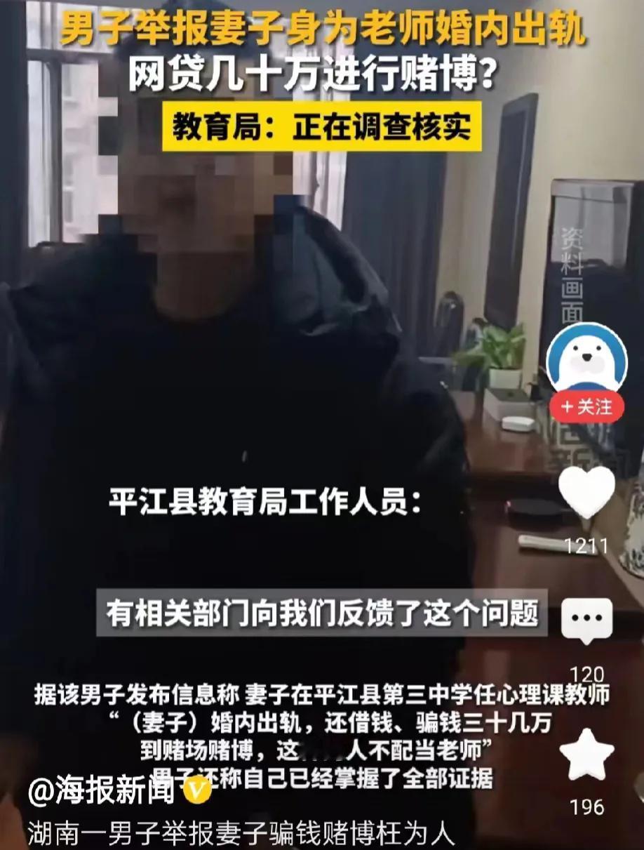 随后女子老公就在网上实名举报女子,说妻子是某学校的老师,经常逃课,出轨与人开房,而且借了几十万元网贷,用于赌博,还到处诈骗。
