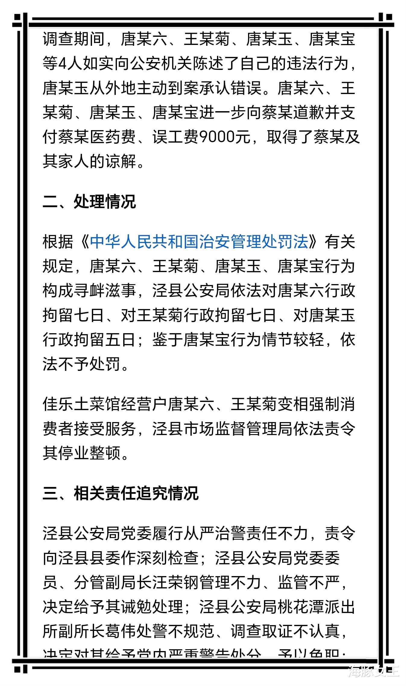 经过舆论的发酵,派出所对唐某六,王某菊,唐某玉,唐某宝进行重新审判,表示他们的行为已经构成了寻衅滋事。