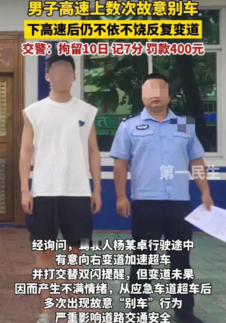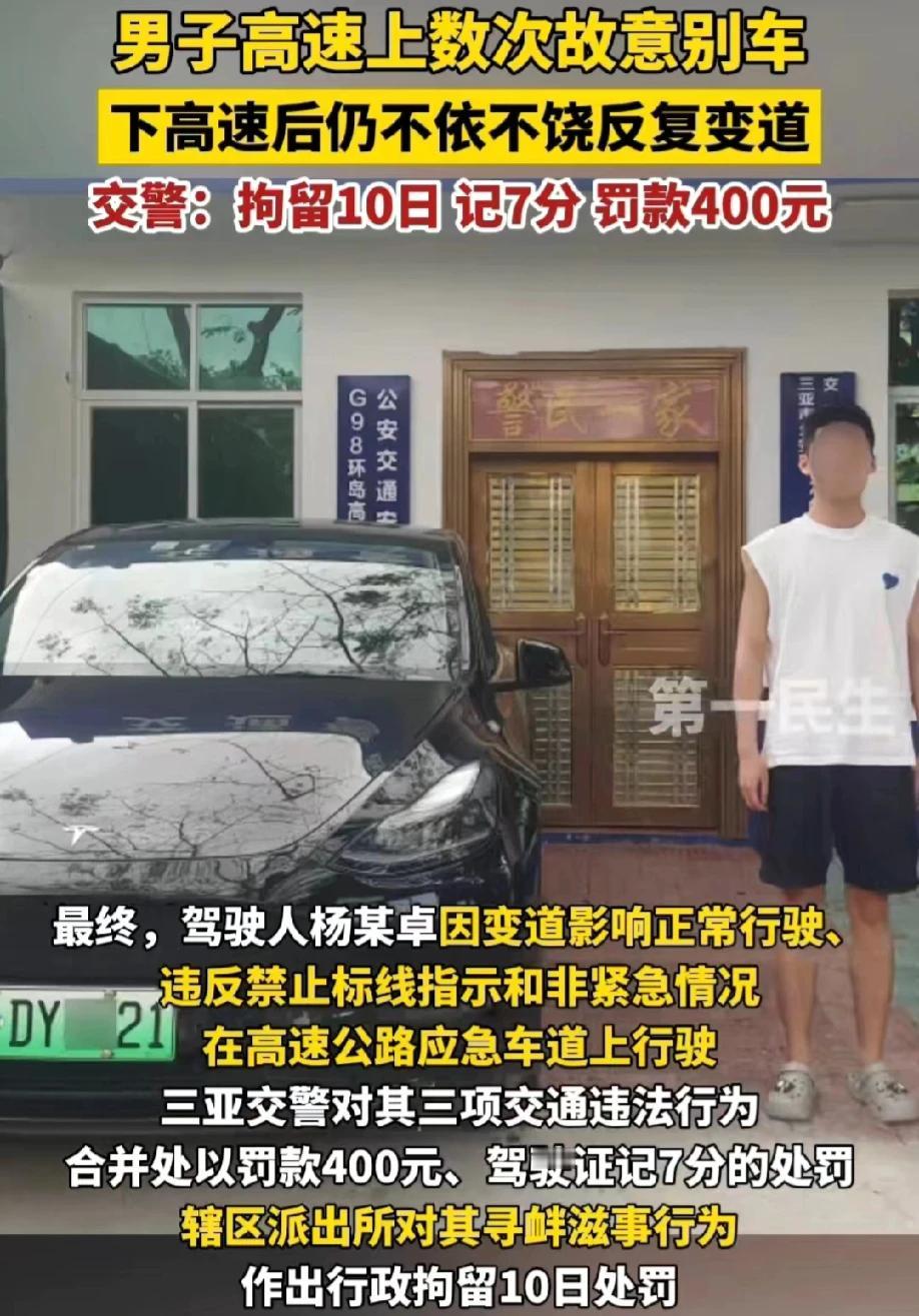 海南三亚,某高速路段,一男子因为变道超车不成,恼羞成怒,从应急车道超车后,开始多次别车,故意变道。后面的车主忍不了了,直接举报。男子被罚款400元,被扣分7分,而后又被行政拘留了10日。