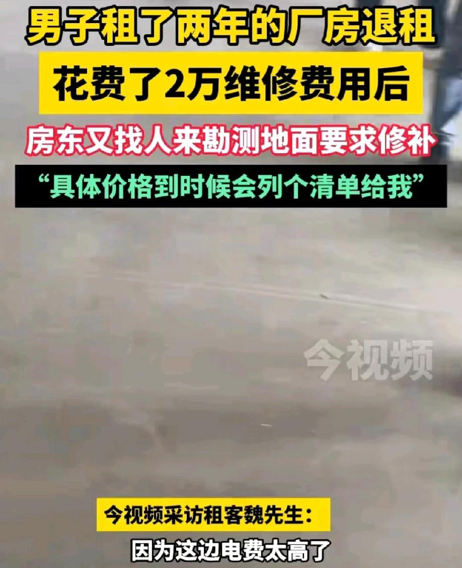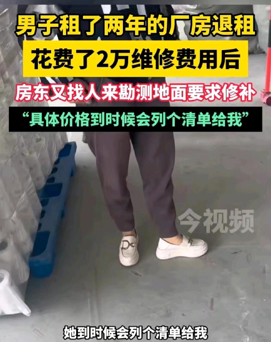 浙江金华,提灯定损没过多久,金华补漆又来了。一男子花了几十万租厂房,因为电费过高,准备搬离。男子为了能够顺利的退租,不让房东找麻烦,特意花了2万多元对厂房进行修补。不料,房东还是找茬,带来了一个师傅,要求男子将地面的划痕进行补漆。男子问需要多少钱,房东说,勘测师傅已经记录了,到时候有个清单会列给你。