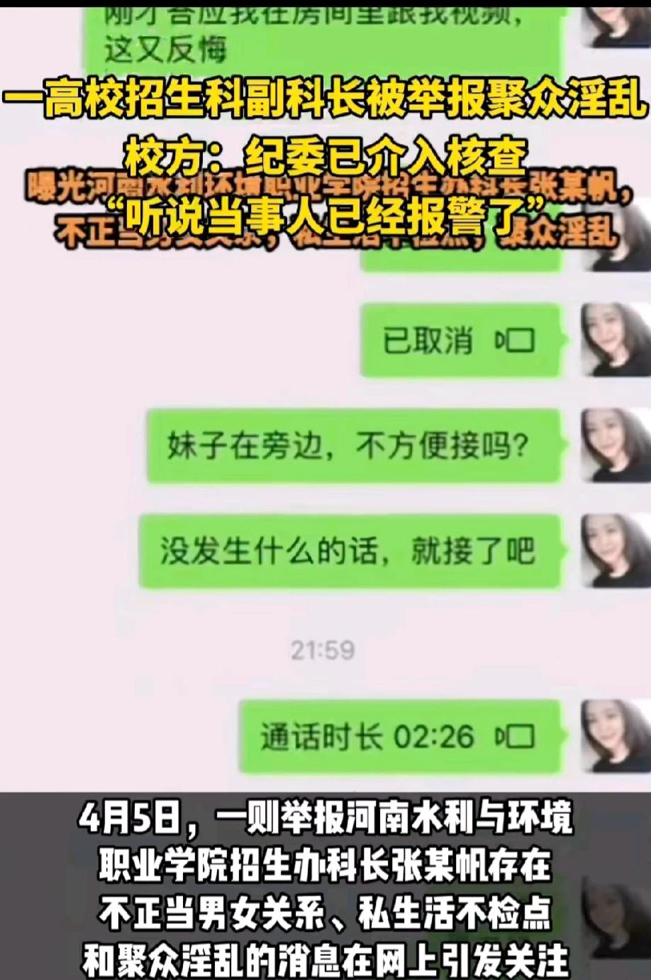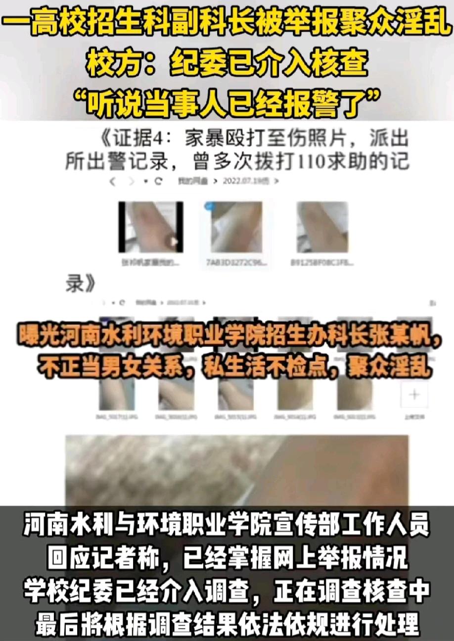 河南某高校,一招生科副科长被举报,存在不正当的男女关系,私生活不检点和聚众淫乱。高校回应道,已关注到这个举报,已经启动了调查,会依法依规进行处理的。高校已经将这名副科长停职了。