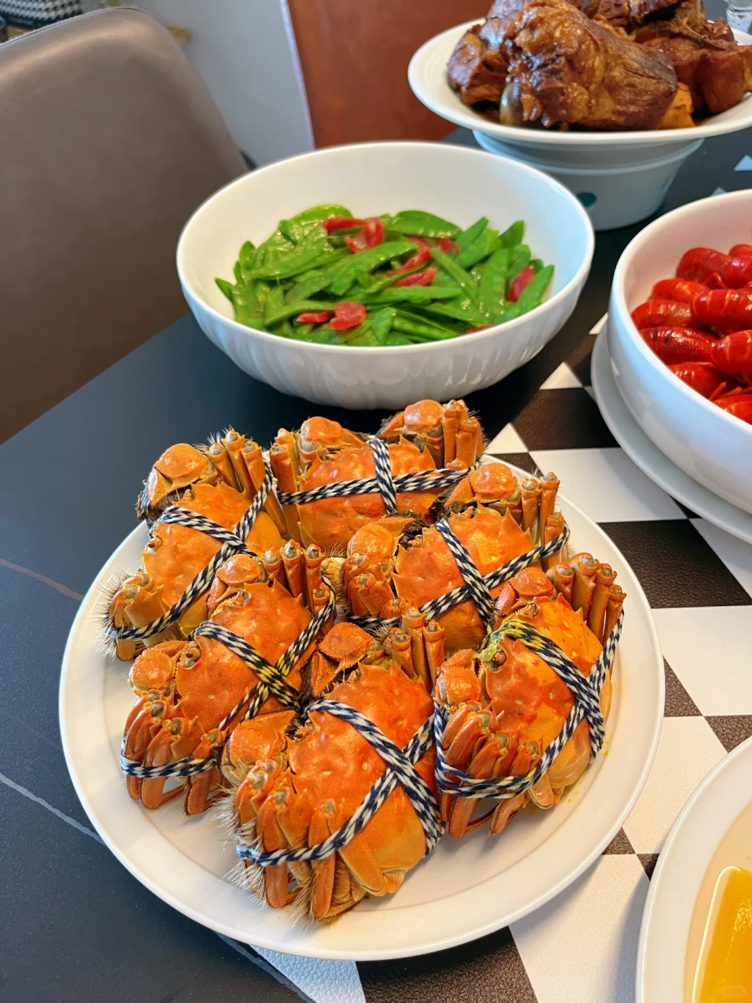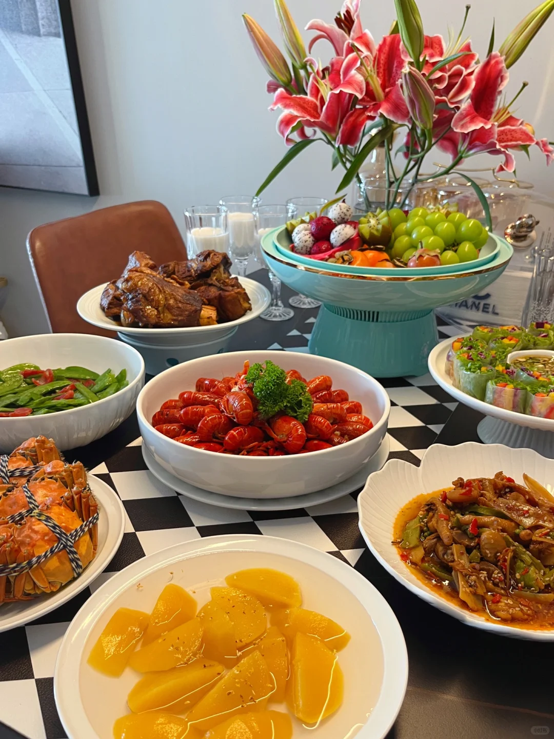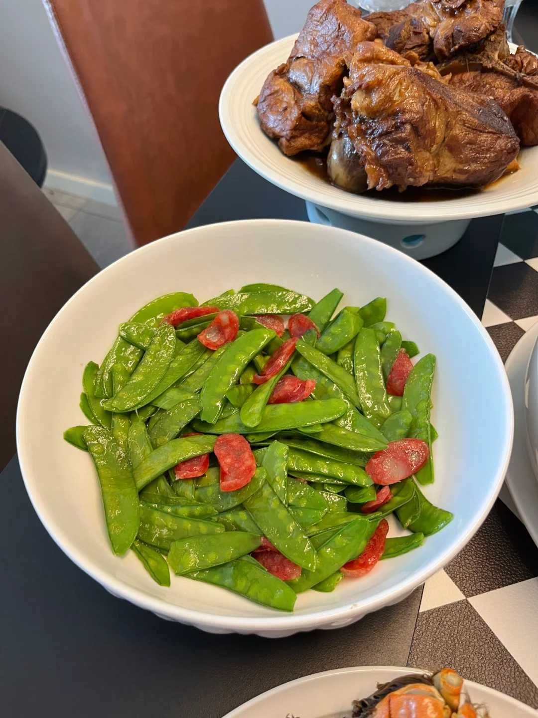 朋友这次来玩有两个愿望,一是带孩子去海边,二是吃我做的饭,哈哈哈哈~安排 【今日菜单:】 酱棒骨 蒜香小龙虾 大闸蟹 椒麻大杂烩 越南蔬菜春卷 腊肠炒荷兰豆 自制黄桃罐头 水果拼盘