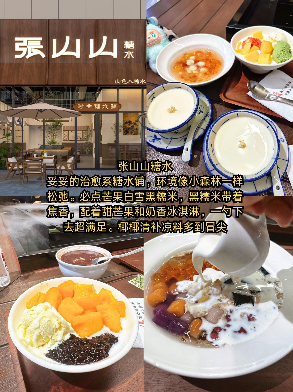🍧张山山糖水:环境像小森林一样舒服,坐下来就很松弛!芒果白雪黑糯米是招牌,黑糯米带点焦香,配着甜芒果和奶香冰淇淋,一口下去超满足