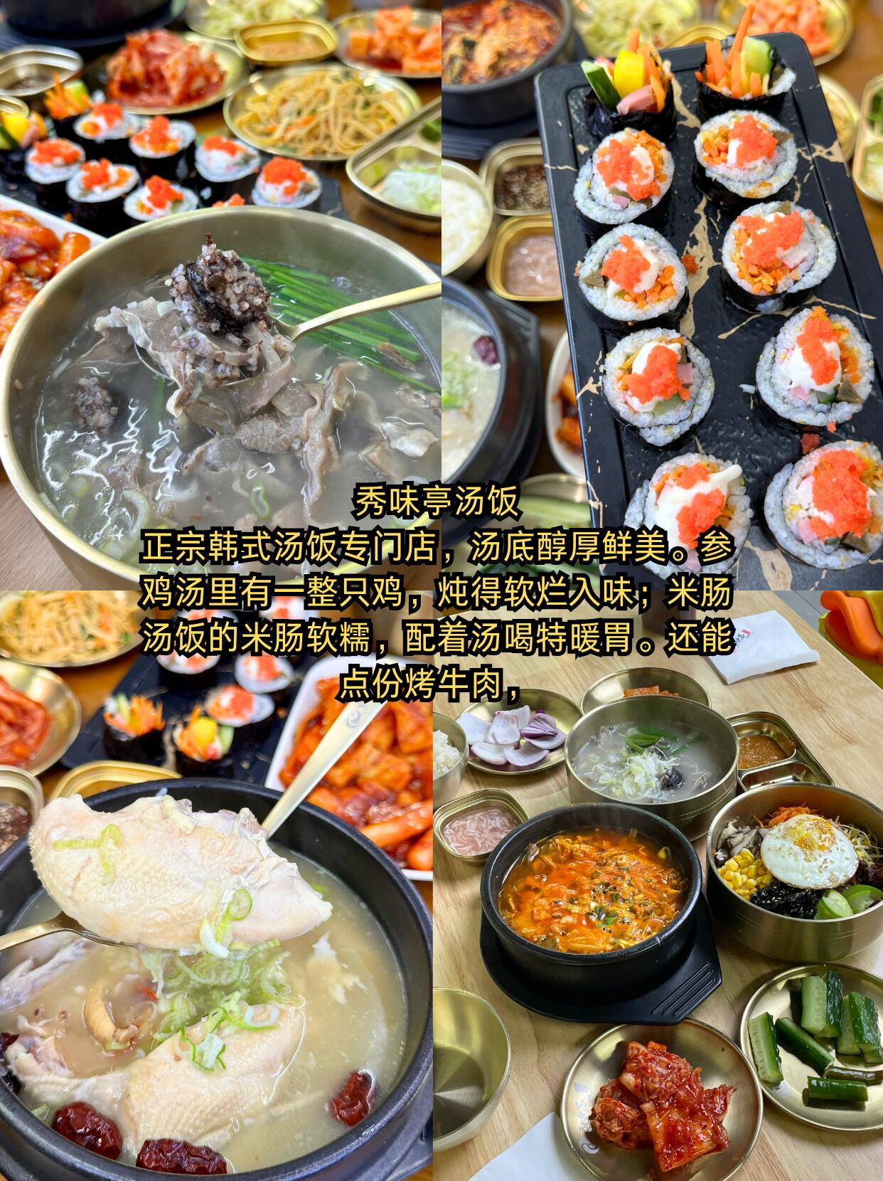 🥘秀味亭汤饭:想喝热汤就来这家!正宗韩式汤饭,一口暖到心里~参鸡汤里有一整只鸡,炖得软烂脱骨,汤鲜不腻;米肠汤饭的米肠软糯,配着汤喝超舒服
