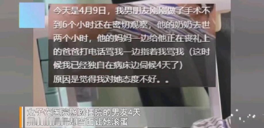天津,一女子在医院照顾男友四天,不料男友的母亲竟然当面叫女子滚蛋。原来男友的母亲觉得女子对她的态度不好。此时男友刚做完手术不到六个小时,正在密切观察。网友:麻溜的走人,又不欠她的。