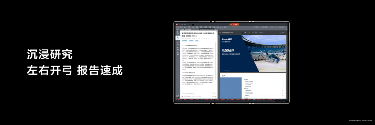 工作效率对于需要深度分析的投资者与行业研究员至关重要,Mate XTs的大屏优势更加凸显。有时阅读行业研报、查看企业财务报表,传统手机小屏需频繁滑动、缩放,信息获取效率大打折扣,而华为Mate XTs非凡大师的大屏不仅能显示文档更多内容,还能左右开弓,一边查看研报核心观点、一边一键提取图表数据并行不悖,搭配语音输入功能快速生成分析报告与市场点评,信息处理效率大幅提升。