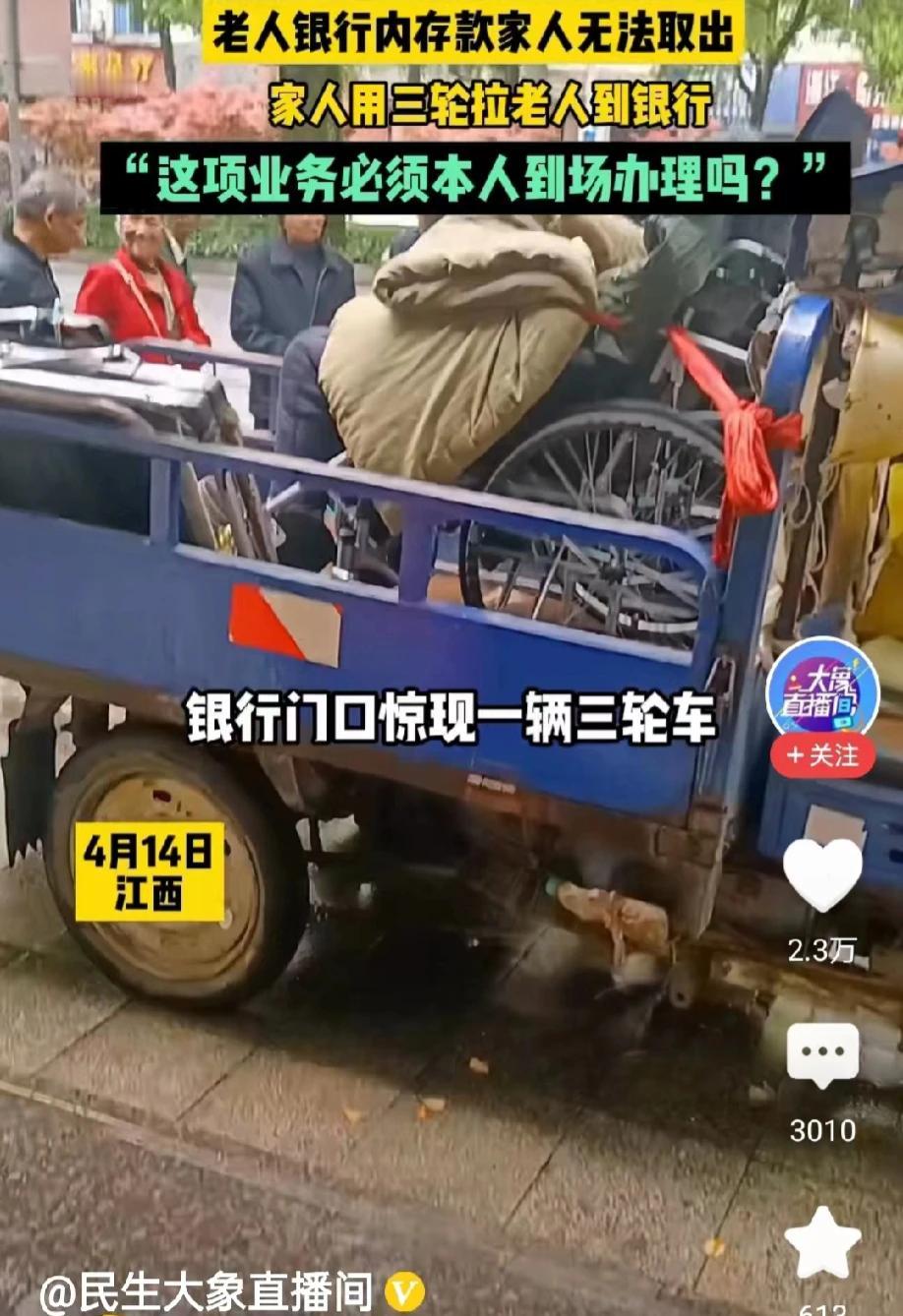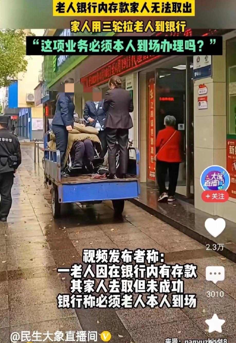 江西,网传视频,一老人在银行的存款,老人家人去领取,却遭到了银行工作人员的拒绝。银行工作人员一定要求老人本人到场。家属无奈,只好将行动不便的老人,用三轮车拉到银行。此事很快就引起了围观。那么银行工作人员的做法对吗?