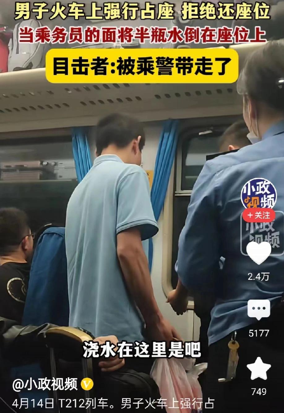 T212列车,一年轻男子霸占靠窗座位,在男子旁边年纪更大一点的大哥原本的位置是靠窗的。但年轻男子不愿意让座。后来女乘务员过来协调,要求年轻男子让座。可年轻男子为了霸座,竟然从包里掏出一瓶水,将水倒在靠窗的位置。后来该名年轻男子被乘警带走调查。
