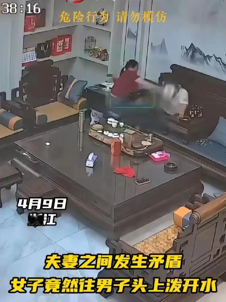 原来视频中的男子和女子是夫妻关系,因为发生了家庭矛盾,妻子非常的生气,于是趁丈夫不备,提起旁边的烧水壶,竟然直接将开水浇在丈夫的头上。