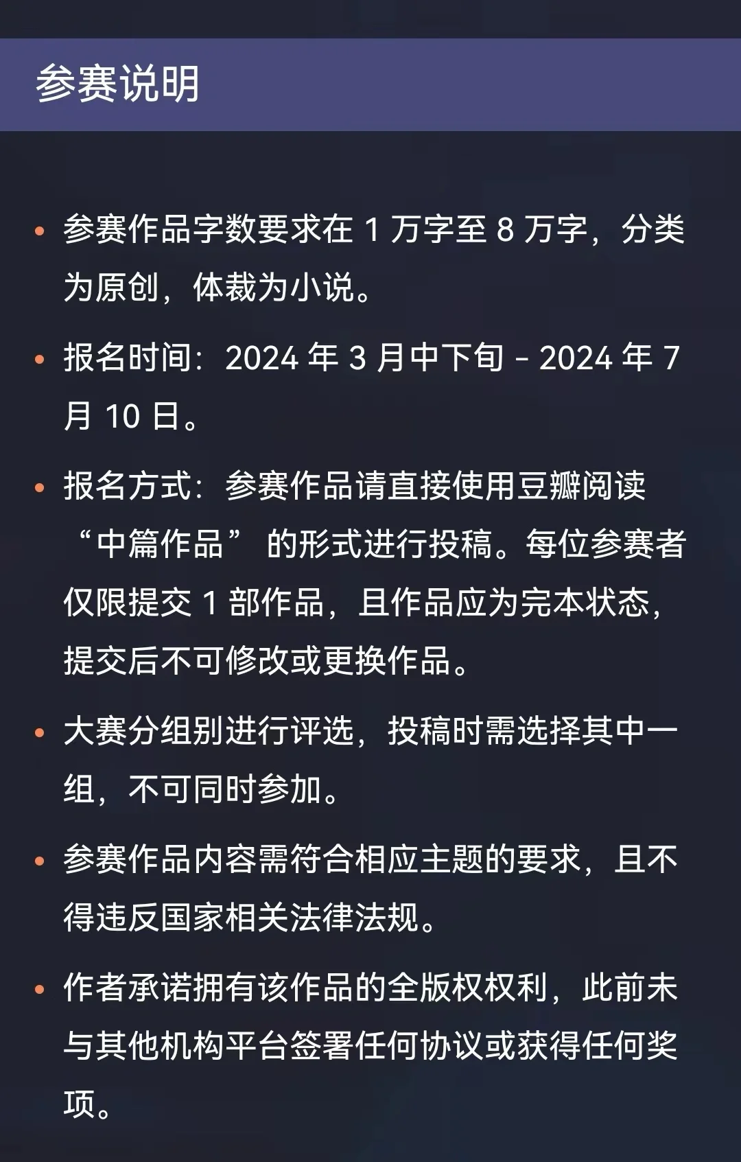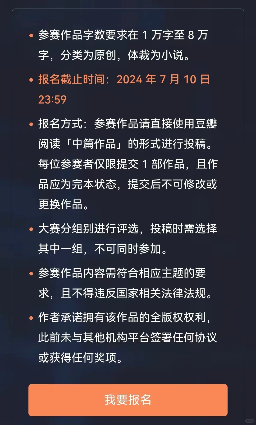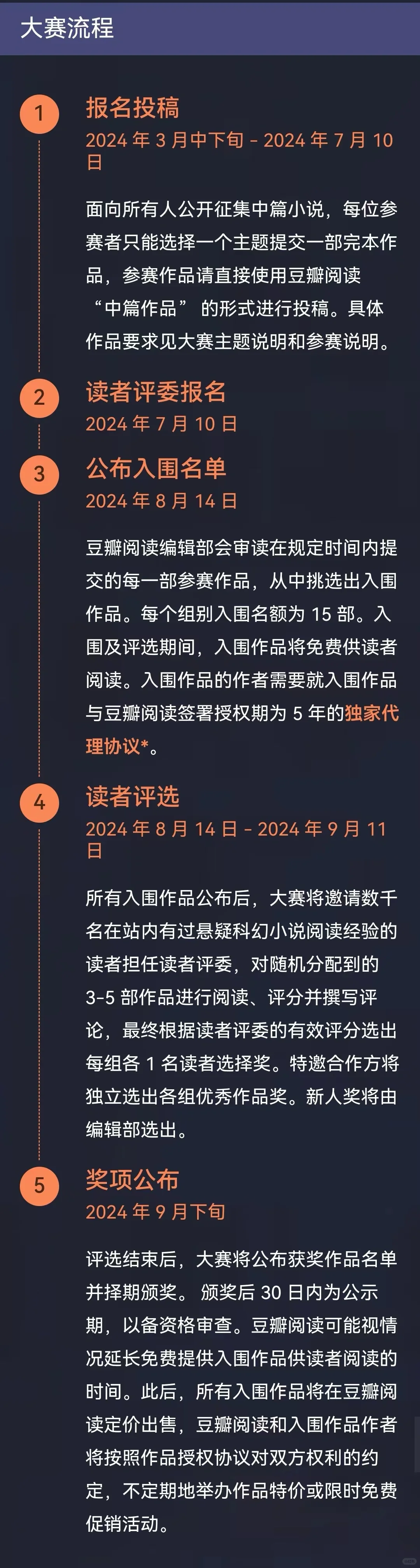 「豆瓣阅读」 悬疑科幻1~8万字中短篇征文!电影改编+奖金! 🌟字数要求宽松,1万字~8万字。 🌟主题分为悬疑和科幻两组,需要二选一,每人只能投一部,作品要是原创小说。 🌟有优秀作品奖、新人奖、读者选择奖,奖品是奖金和电影版权关注。 🌟特邀合作方是三家电影公司:联瑞影业、光线影业、壹同制作。 🌟不得奖但入围了也有奖金,入围了即走签约流程。 🌟没入围的话作品最后会退回,归作者自己处理。 🌟报名已经开了,感兴趣的可以投稿试试!