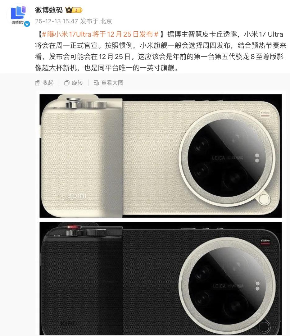 首先是发布日,小米17Ultra已经确定会在2025年12月底发布,目前比较靠谱的预测是12月25日星期四。