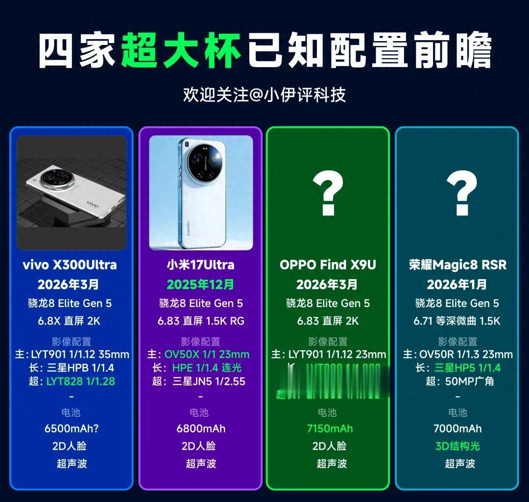 小米17Ultra已经确定是6800毫安时电池;OPPO Find X9Ultra 7150毫安时电池;荣耀Magic 8RSR(Ultra)7000毫安时电池。