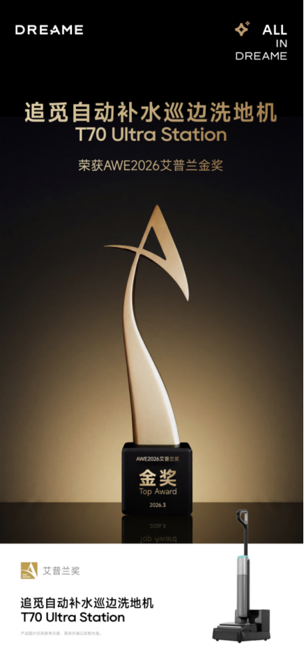 前机械臂升级至灵捕广域机械臂3.0,抬升高度提升142%,配合灵羽超轻薄2.0系统,保持9.85cm机身的同时吸力达27000Pa,支持180°恒动平躺深入床底沙发底清洁。本届AWE 2026展会期间,T70 Ultra Station荣获艾普兰奖金奖,是本届唯一获此殊荣的洗地机品牌。
