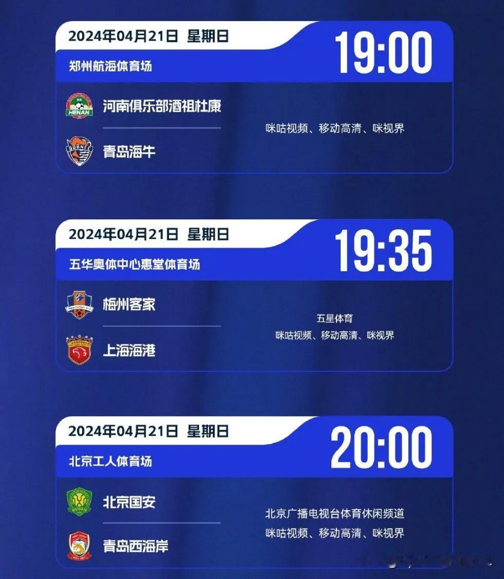 中超联赛4月21日赛程、直播预告:
