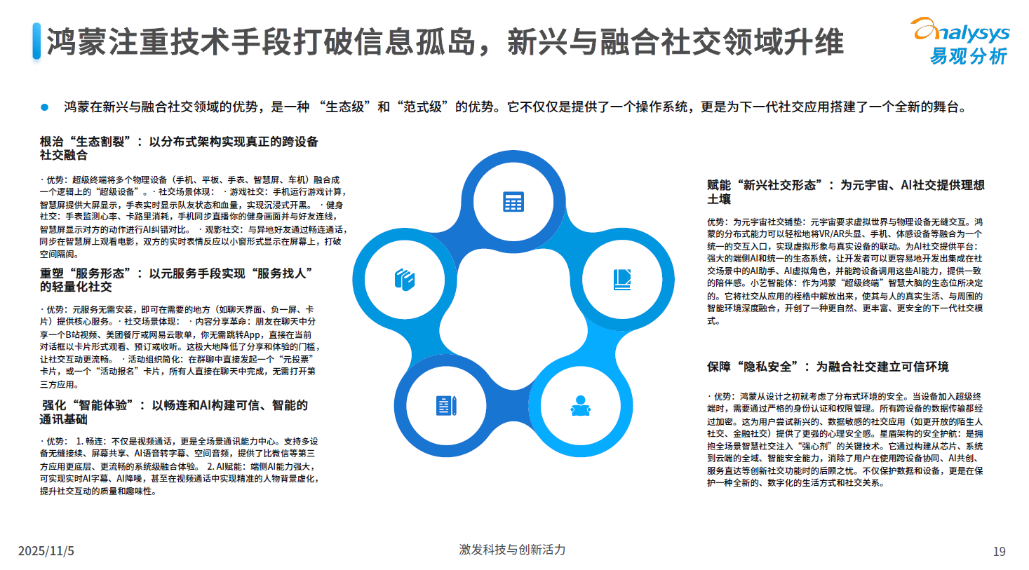 社交通讯赛道:“新兴与融合社交”(如元宇宙、虚拟社交)被明确为未来发展方向,是高成长的机遇所在。报告强调,鸿蒙生态注重技术手段打破信息孤岛,以分布式架构实现跨设备社交融合,以元服务实现“服务找人”的轻量化社交,以畅连和AI构建智能通讯基础。
