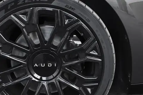 来到侧面,溜背式车身造型搭配隐藏式门把手,让车身线条流畅得就像灵动的乐章,而电子外后视镜的加入,更是为这份流畅增添了一抹浓郁的科技韵味。不过,钦定性能quattro型在侧面真正的变化亮点,藏在其脚下的“战靴”——一套20英寸的轮毂,以及奥迪赋予“鸳鸯胎”美名的非对称轮胎配置。具体来说,前轮胎宽为245毫米,后轮宽度竟达到了同级别车型中极为罕见的285毫米。这种常见于高性能跑车的配置,不仅在视觉上带来强烈的冲击感,更在实质上显著提升了车辆在过弯和高速行驶时的抓地力与稳定性。车尾部分,环形贯穿式尾灯与车头遥相辉映,底部熏黑的扩散器和镂空尾翼,如同点睛之笔,恰到好处地渲染出整车浓郁的运动气息。