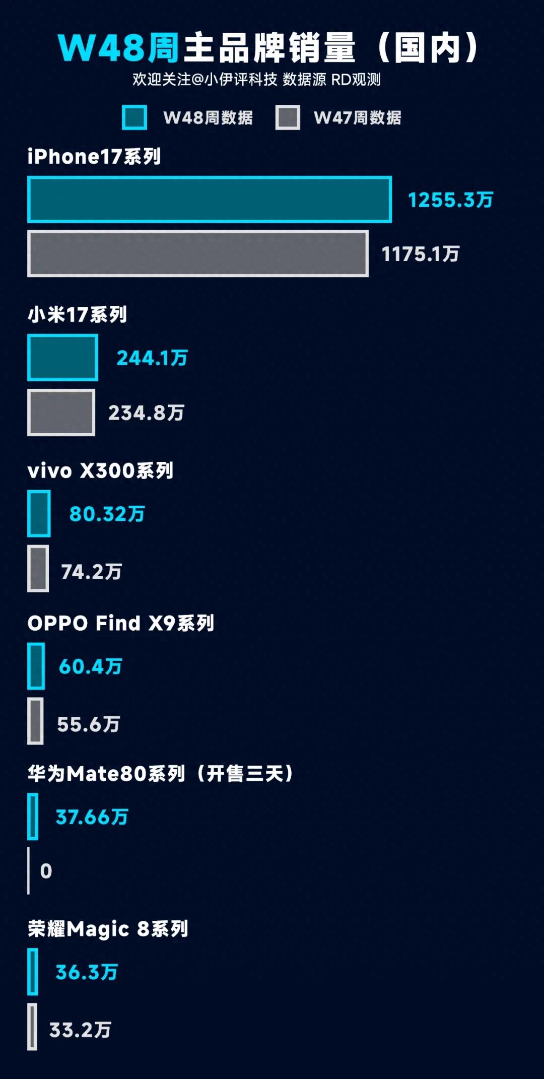 RD观测又公布了截止到11月30日,W48周的各家主要产品的销量情况,笔者同样给大家绘制一批图,同时还包括W47周的销量同比以及增量的数据,多图流如下所示: