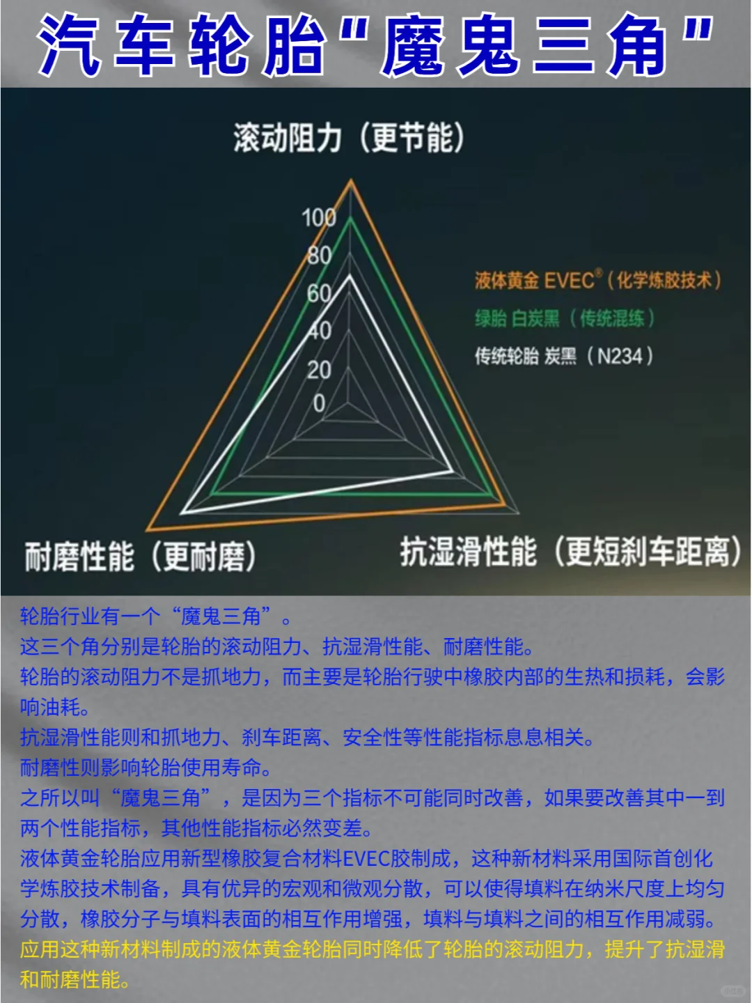 这三大基本性能不能同时提升,其中一项提高了其他两项就得弱化,这种叫轮胎行业的“魔鬼三角”。