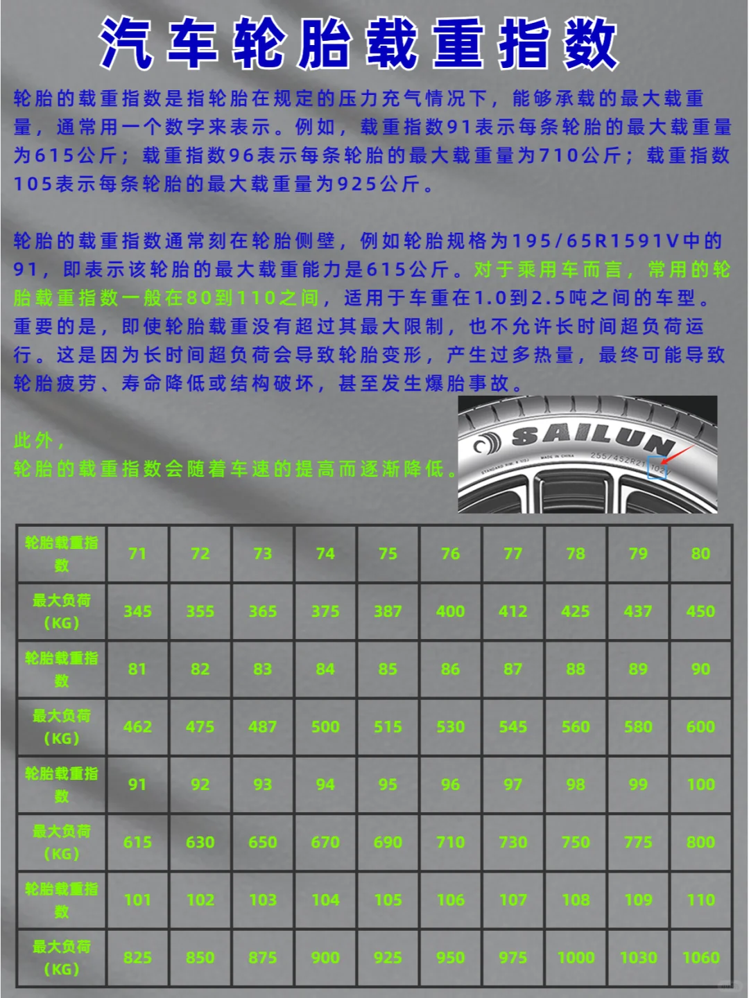 轮胎的载重指数表示在规定的压力下,轮胎所能承载的最大载重量。这通常用一个数字表示,例如91表示每条轮胎的最大载重量为615公斤。