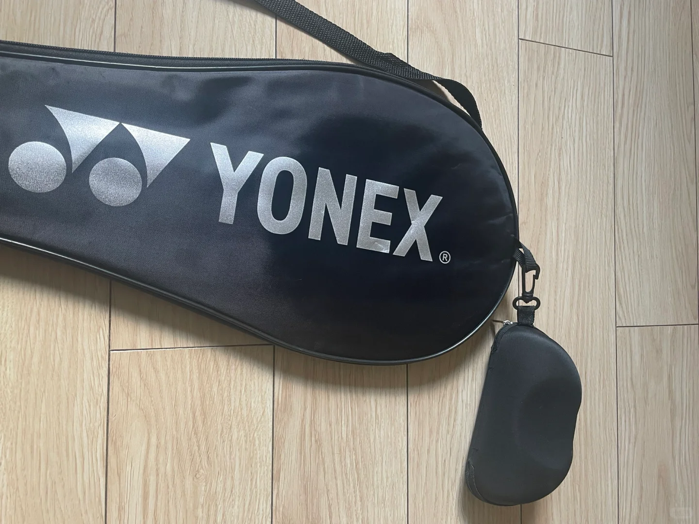 然后墨镜盒上面的挂钩可以直接挂在羽毛球拍到包装袋上面,出行拿着方便了,也不用担心羽毛球会丢了。