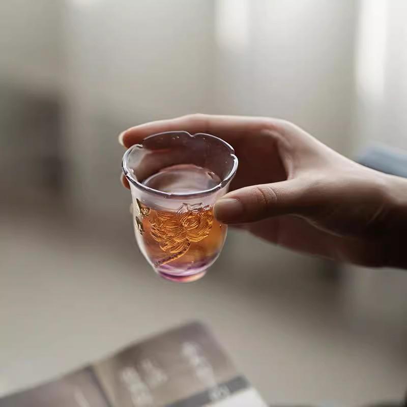 将梁祝杯置于茶席之上,与香茗相伴,更是别有一番韵味。当清澈的茶汤倒入杯中,茶汤的颜色与琉璃的色彩相互映衬,相得益彰。浅黄的茶汤在蓝色琉璃杯的衬托下,显得更加明亮、澄澈,宛如一泓清泉;而深红的茶汤在粉色琉璃杯的映照下,则愈发浓郁、醇厚,仿佛诉说着岁月的沉淀。此时,轻轻端起杯子,茶汤的香气袅袅升腾,与琉璃杯散发的艺术气息相互交融,让人在品味茶香的同时,也能尽情领略梁祝杯的艺术之美,达到一种身心愉悦的境界。