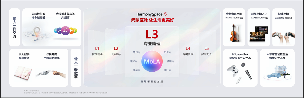 鸿蒙座舱率先迈入“智能座舱L3”时代。其基于MoLA混合大模型架构,实现语音从被动响应到主动服务的跨越,可完成点外卖、支付等生活操作。目前鸿蒙座舱用户超130万,此次新增HUAWEISOUND空间音专区及影视、游戏等场景化服务,进一步强化全场景智能体验。