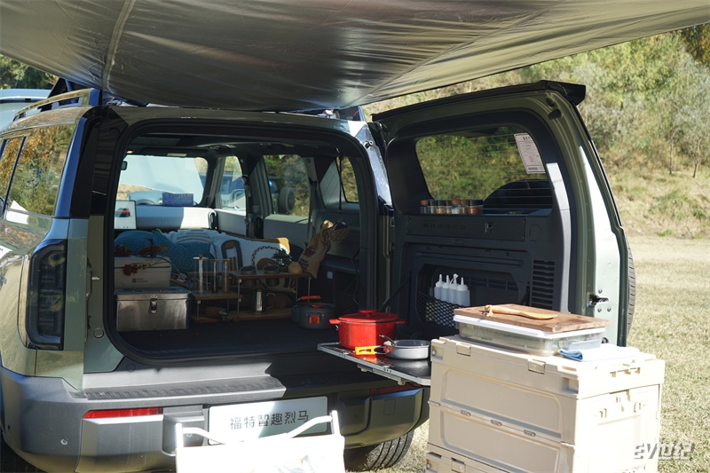 作为一款露营SUV,除了车内大床解决“住”的需求之外,利用多功能尾门设计出来的“山野厨房”系统也能解决“吃”的问题。后备厢尾门配有铝合金材质的桌板,最大承重18kg。打开尾门,放下小桌板就是灶台,内嵌有一个电磁炉,尾门上有放东西的网格,后备厢有220V电源插座,车辆有6.6kW大功率外放电功能,同时带动电磁炉、电水壶、咖啡机等电器完全没问题。在野外能吃口热的,确实能提升幸福感。