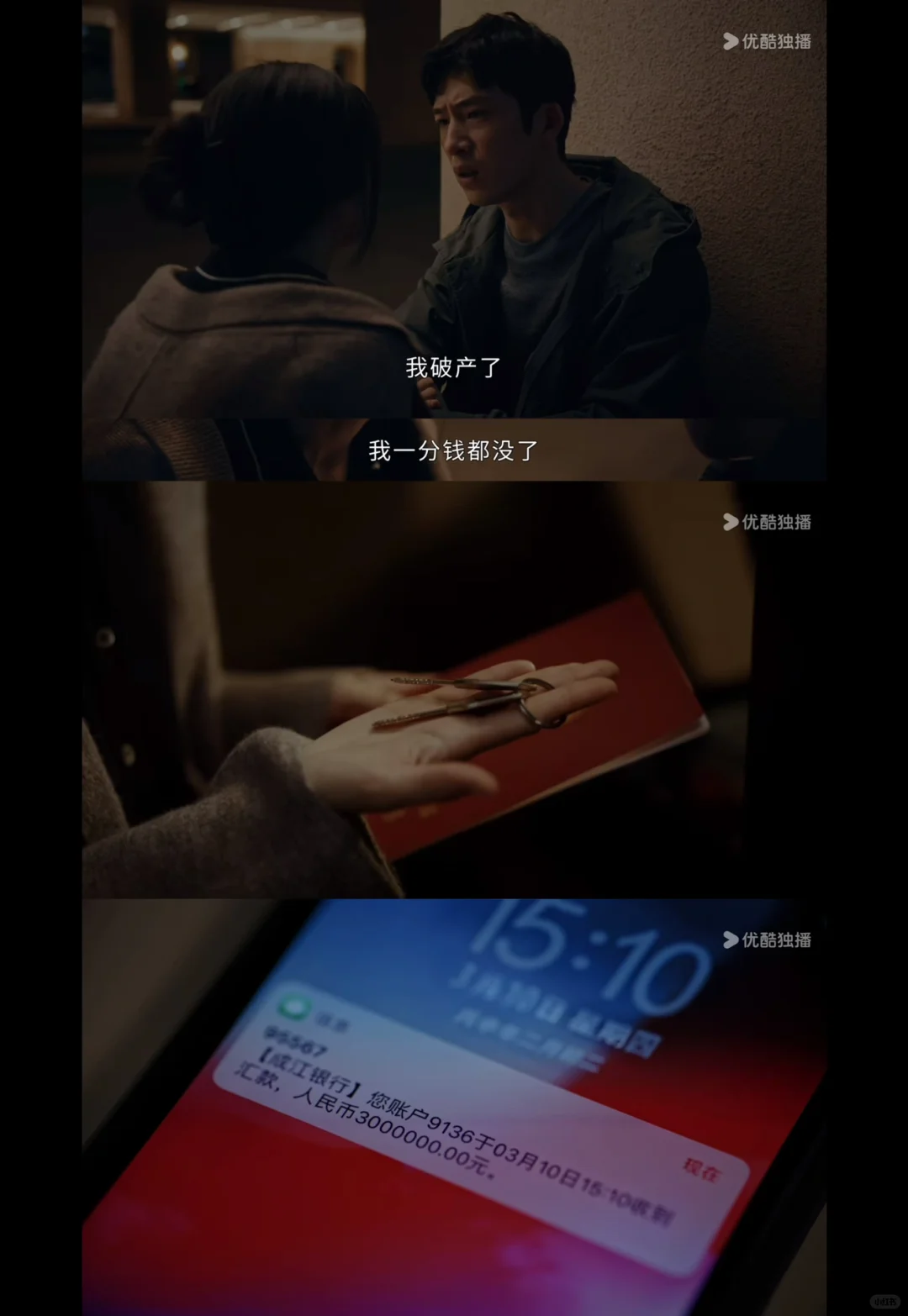 后续就是费可突然消失,再出现就是说被骗破产,不想连累苏倩,苏倩一个心软卖了房子给了300万,费可接到苏倩电话的时候,那个表情是真实的恐怖!