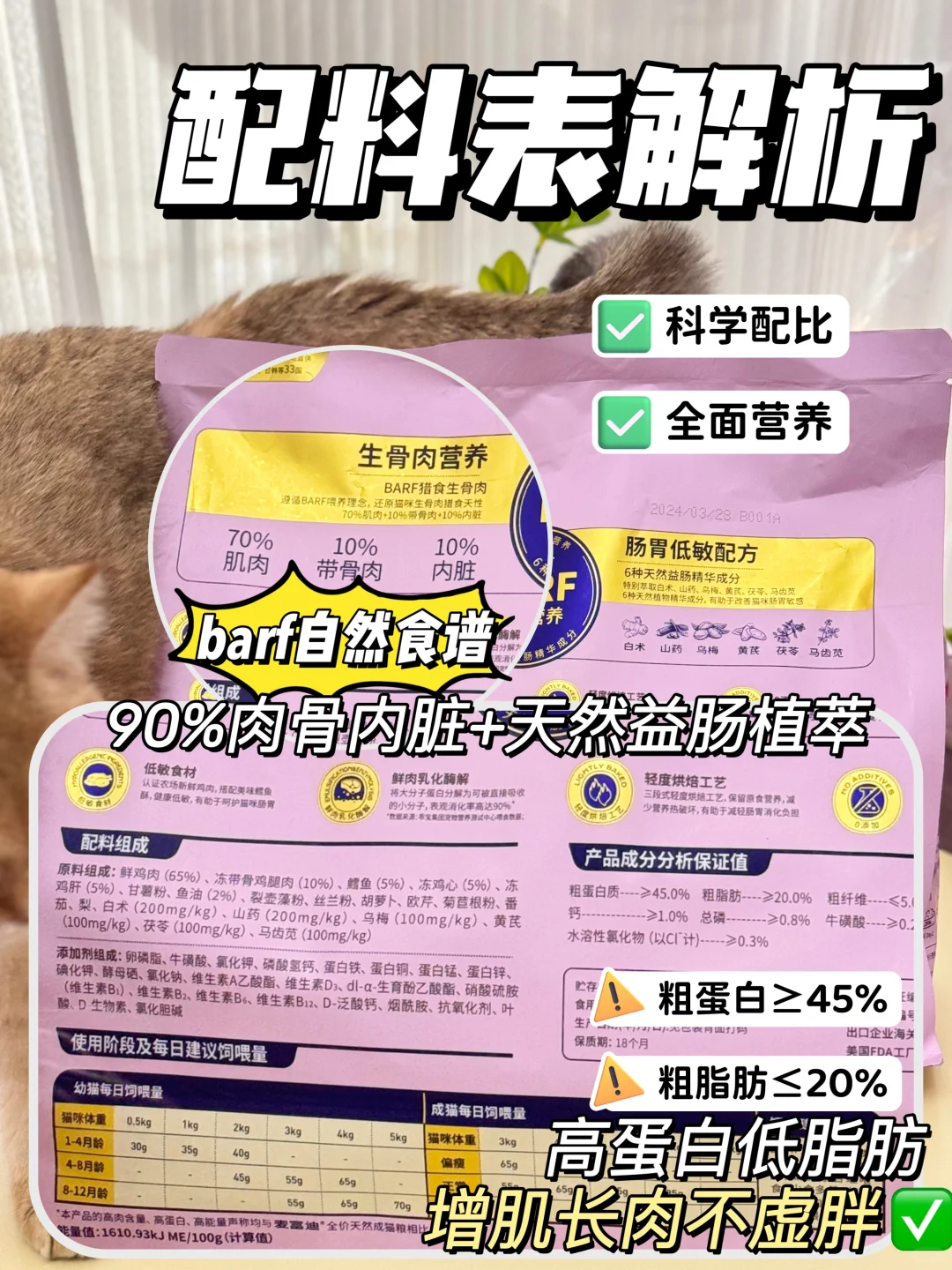 ✅90%肉骨内脏🍗,肉源采用认证农场鲜鸡肉都是0冻肉0肉粉,低敏健康又新鲜,还有45%粗蛋白 ,20%粗脂肪的配比,营养含量很到位。