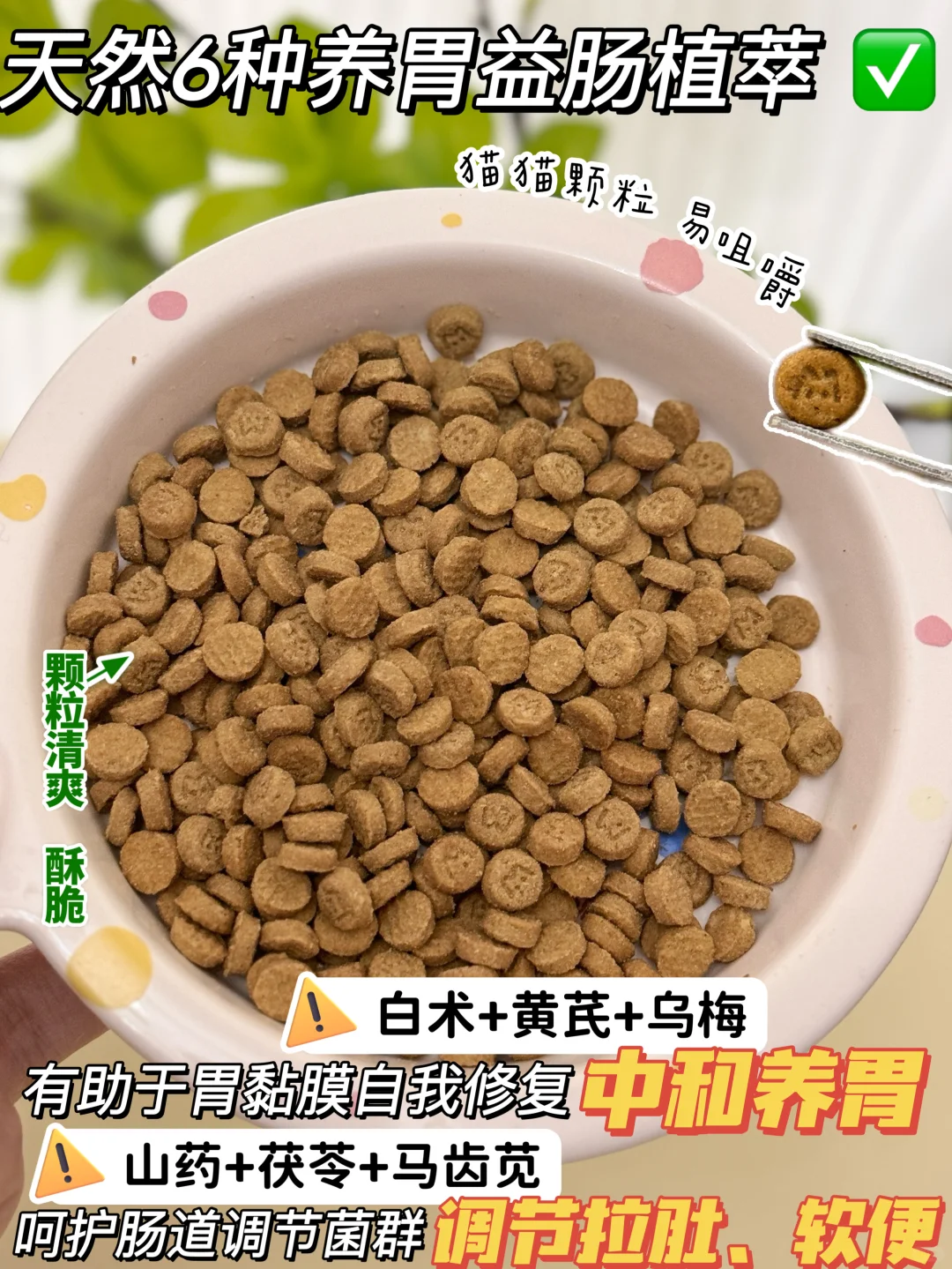 ✅6种益肠植萃💪🏼,是麦富迪&南农大中兽医研究中心联合研发的,提取自乌梅、白术、山药、茯苓、黄芪、马齿苋等天然植物,可以修F肠胃黏膜损伤,根源改善猫咪软便问题,像我家有一只猫肠胃特别脆弱,之前经常吐出未消化的猫粮,最近换成麦富迪这款烘焙粮,吃了一个月左右,确实没有出现过呕吐的情况了。