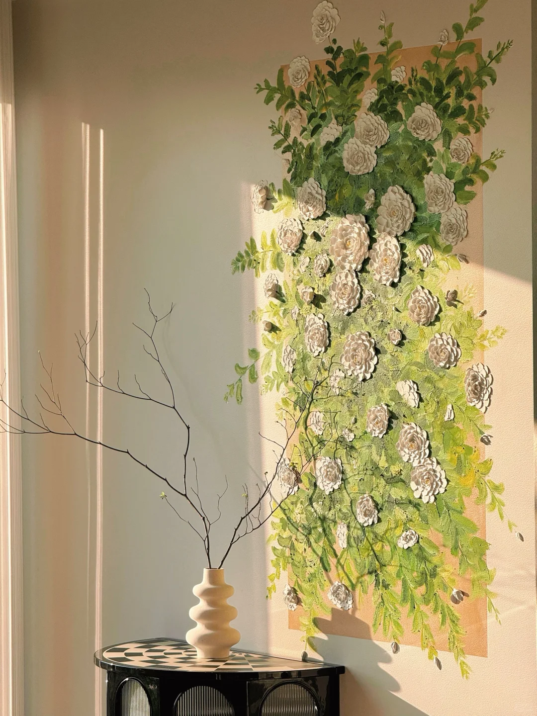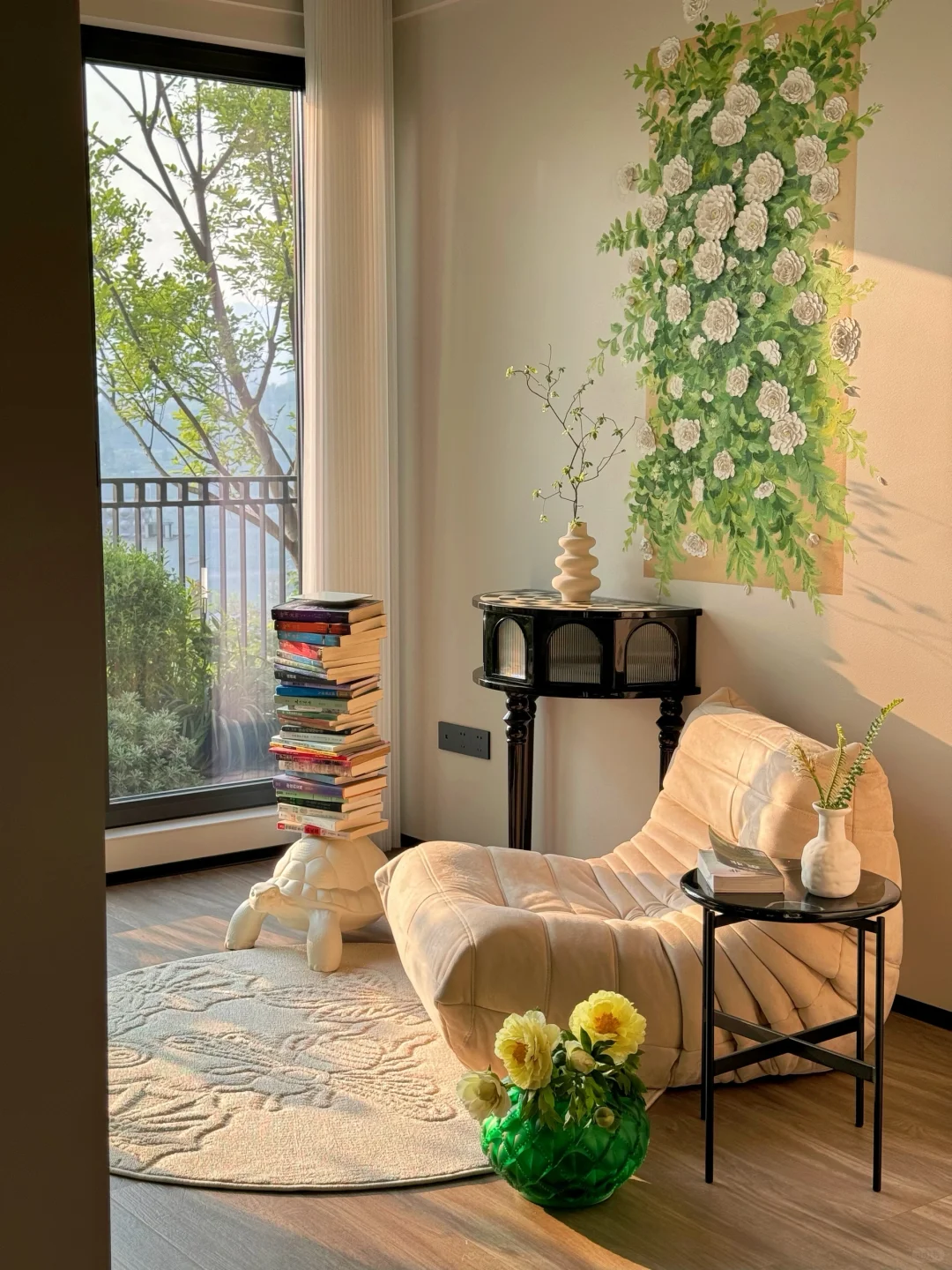 [向右R]比如卧室🛏️的读书角(P[二R]),一开始真没想清楚,索性大白墙,入住后才画的山茶花🌸,是不是好惊艳[偷笑R]