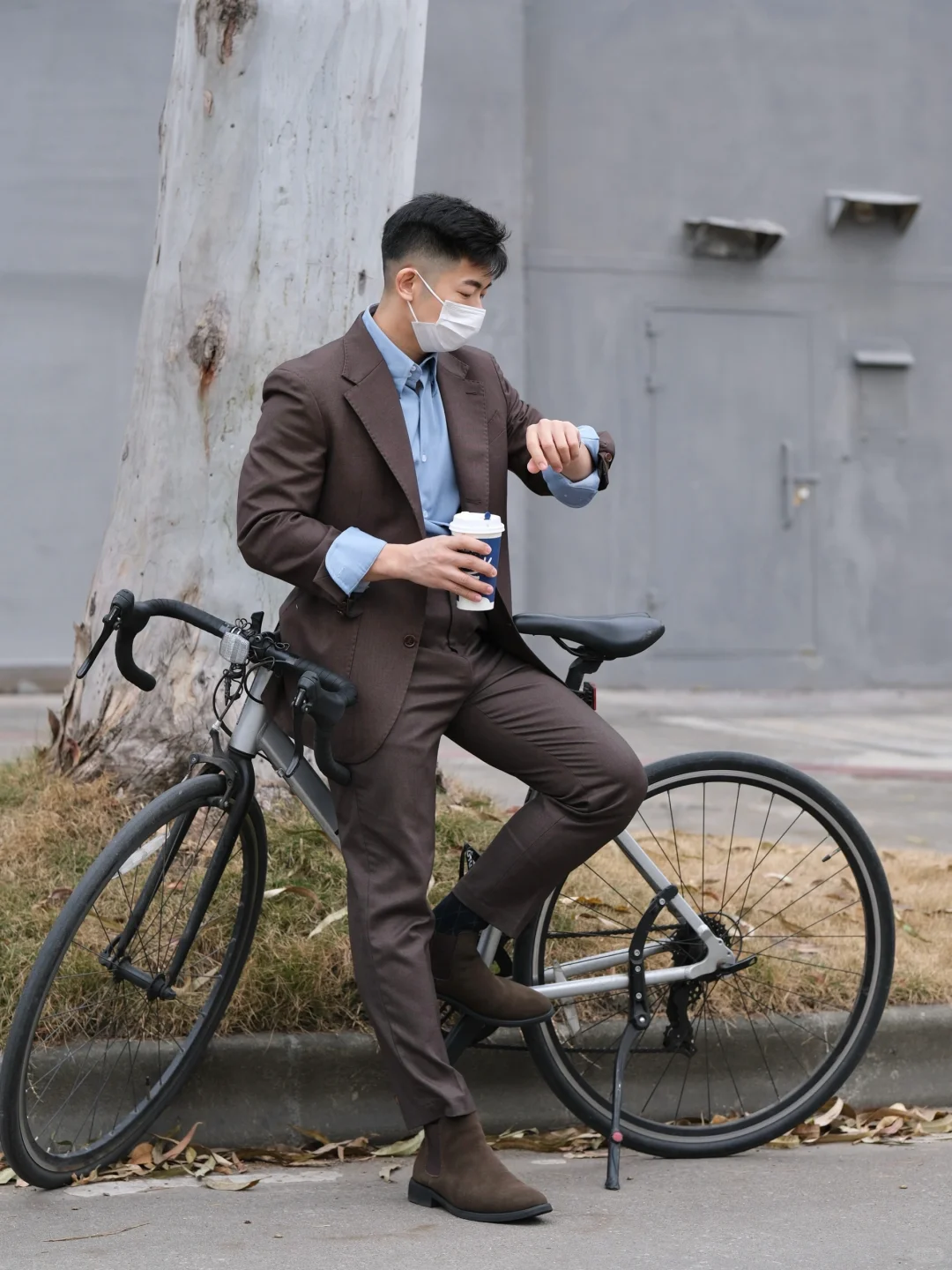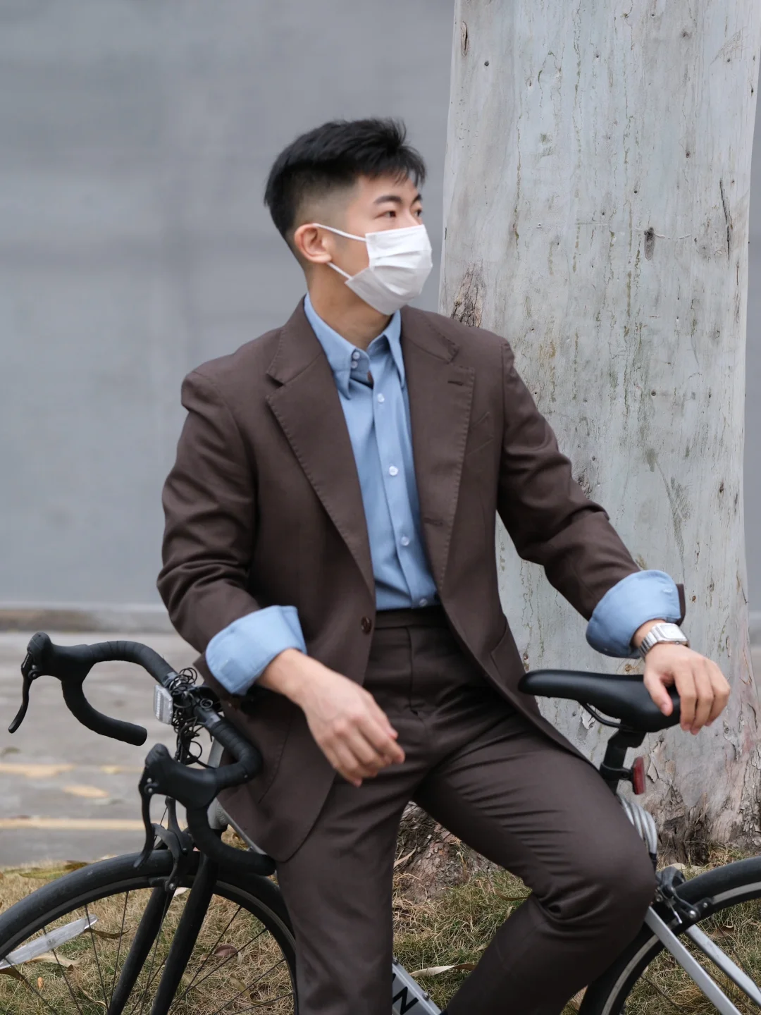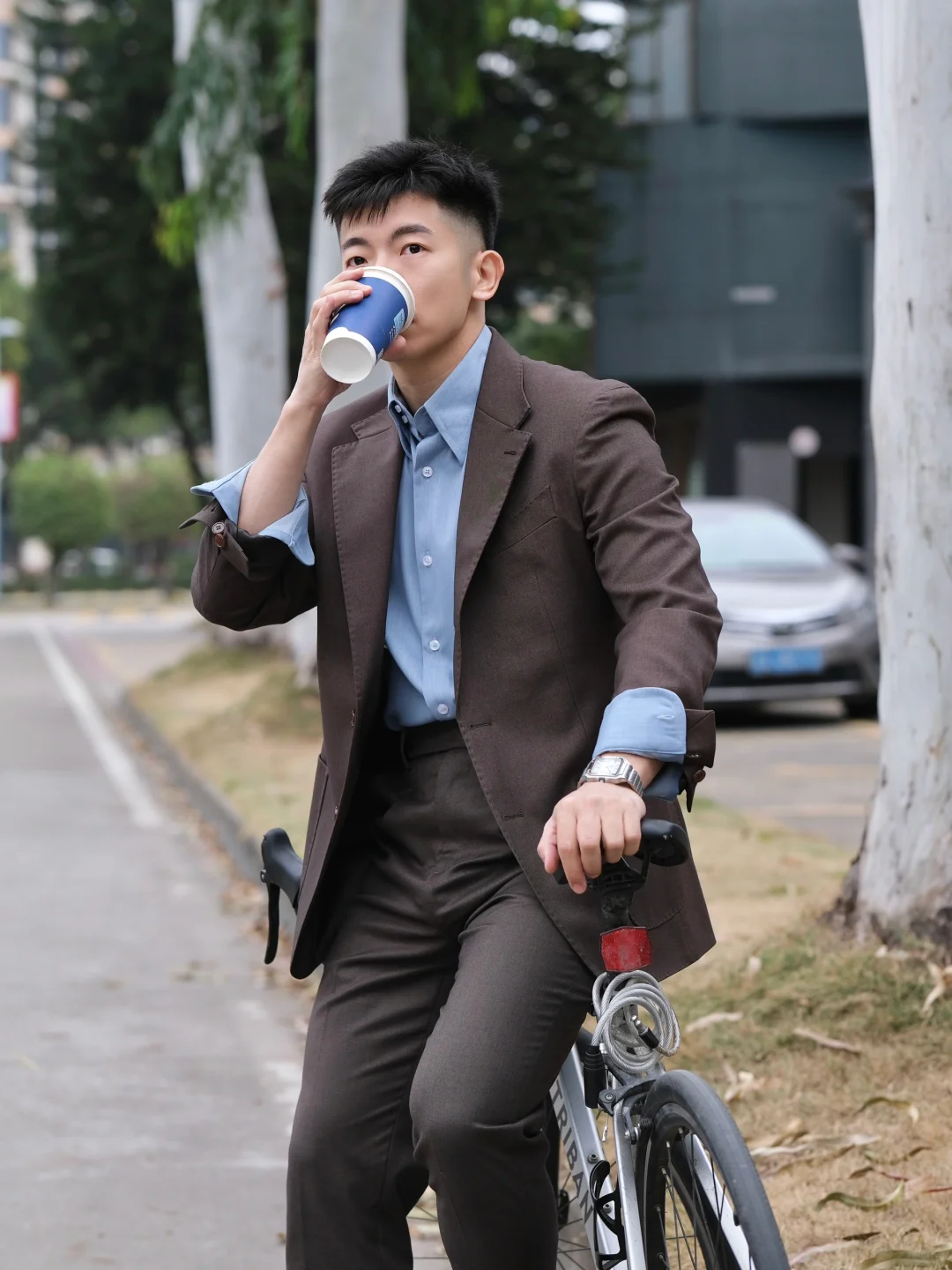 第一天的西装我不要黑色,要有质感和高级感的亚麻棕色,第一天的衬衫我不要白色,要清爽干净的天蓝色,以自己喜欢的方式开始新的旅程。