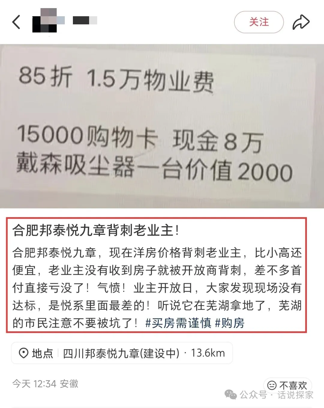 网友吐槽:瑶海区的四川邦泰悦九章背刺老业主,据说是直接85折+1.5万物业费,洋房比小高还便宜,还没收房差不多首付亏没了,此前业主开放日也被曝出不达标…