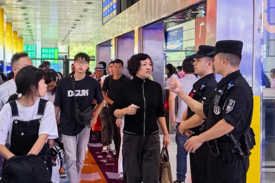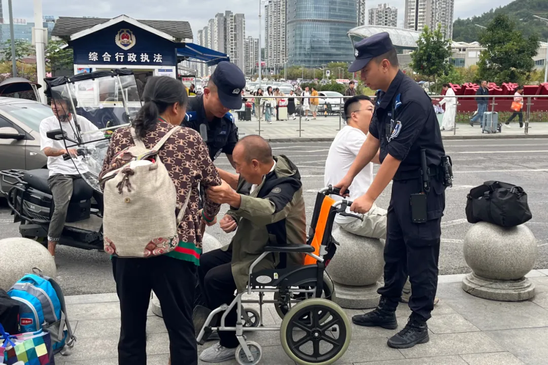 2025年10月1日早上,正值国庆佳节,高铁站内客流涌动。特巡警大队高铁网格巡逻队员接到群众邹先生求助,其因行动不便,又携带较多行李,眼看发车时间临近,急着进站却力不从心。了解情况后,队员立即行动,一边帮邹先生拎起沉重行李,一边小心推着其前行,在拥挤的人流中为他开辟出一条“安全”通道。从站前广场到安检口,再到候车区域,队员全程护送,确保其顺利进站。“多亏了你们,不然我肯定赶不上车了!”邹先生再三致谢。这暖心一幕,正是新蒲公安民辅警践行“群众利益无小事”理念的生动写照。