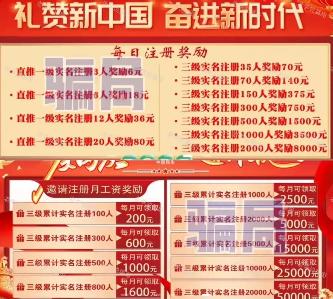 为了达到诈骗目的,谎称实名注册邀请2人后领取“金卡”,即可获得高额国补资产,甚至还可获得每日定涨3元的所谓“国债”。同时利用黄金、房产、现金等诱导参与者拉新。